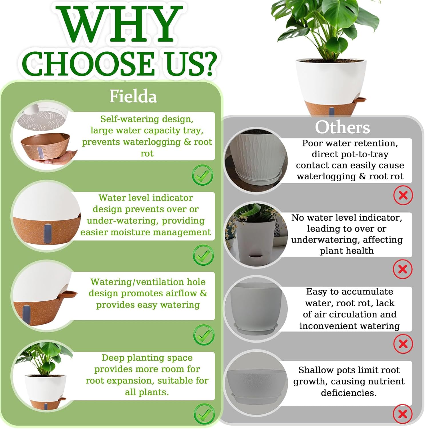 - 📏 【Clear Sizing & Plant Pairing】 🌿 8" Pot: 8" Top Diameter × 6.9"H (≈Dinner Plate) → For 6-12" Tall Plants (Snake Plant, Small Pothos, African Violet, Snapdragon, Spider Plant) 🌿 10" Pot: 10" Top Diameter × 8.3"H (≈Basketball) → Best for 12-18" Plants (Monstera, ZZ Plant) 🌿 12" Pot: 12" Top Diameter × 10.2"H (≈Pizza Pan) → Fits 18-24" Plants (Fiddle Leaf Fig, Dracaena, Money Tree, Large Monstera, Geranium) ⚠️ Critical Notes: ✗ Succulents: Fill only 1/3 reservoir ✗ Measure from soil to leaf tip + add 2" margin