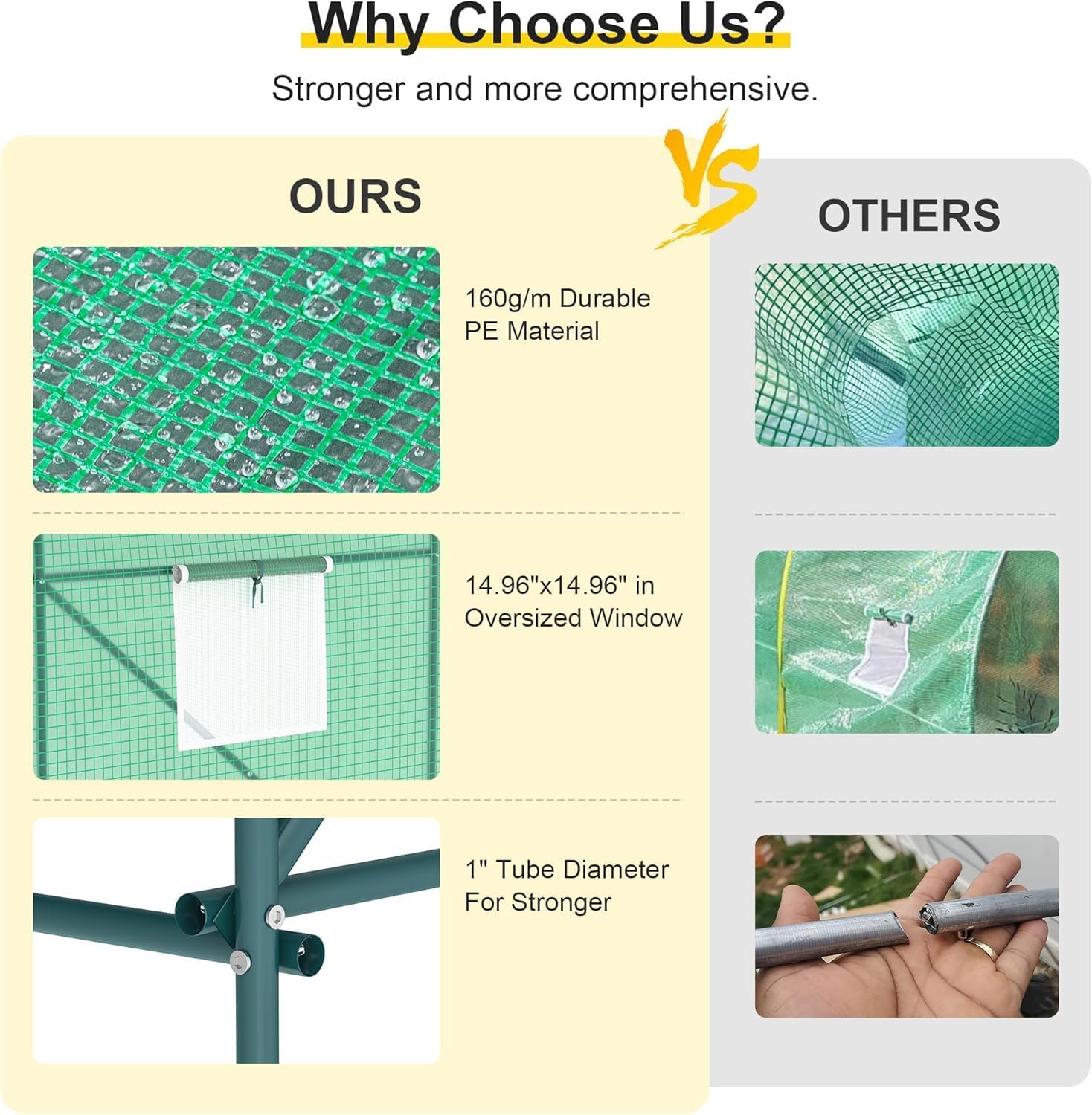 - 【Heavy Duty Galvanized Frame】We have upgraded the load-bearing bar of the warming house, using high quality galvanized material to increase a certain amount of load-bearing; the horizontal bar and 4 diagonal bars greatly improve the stability of the tunnel green house.