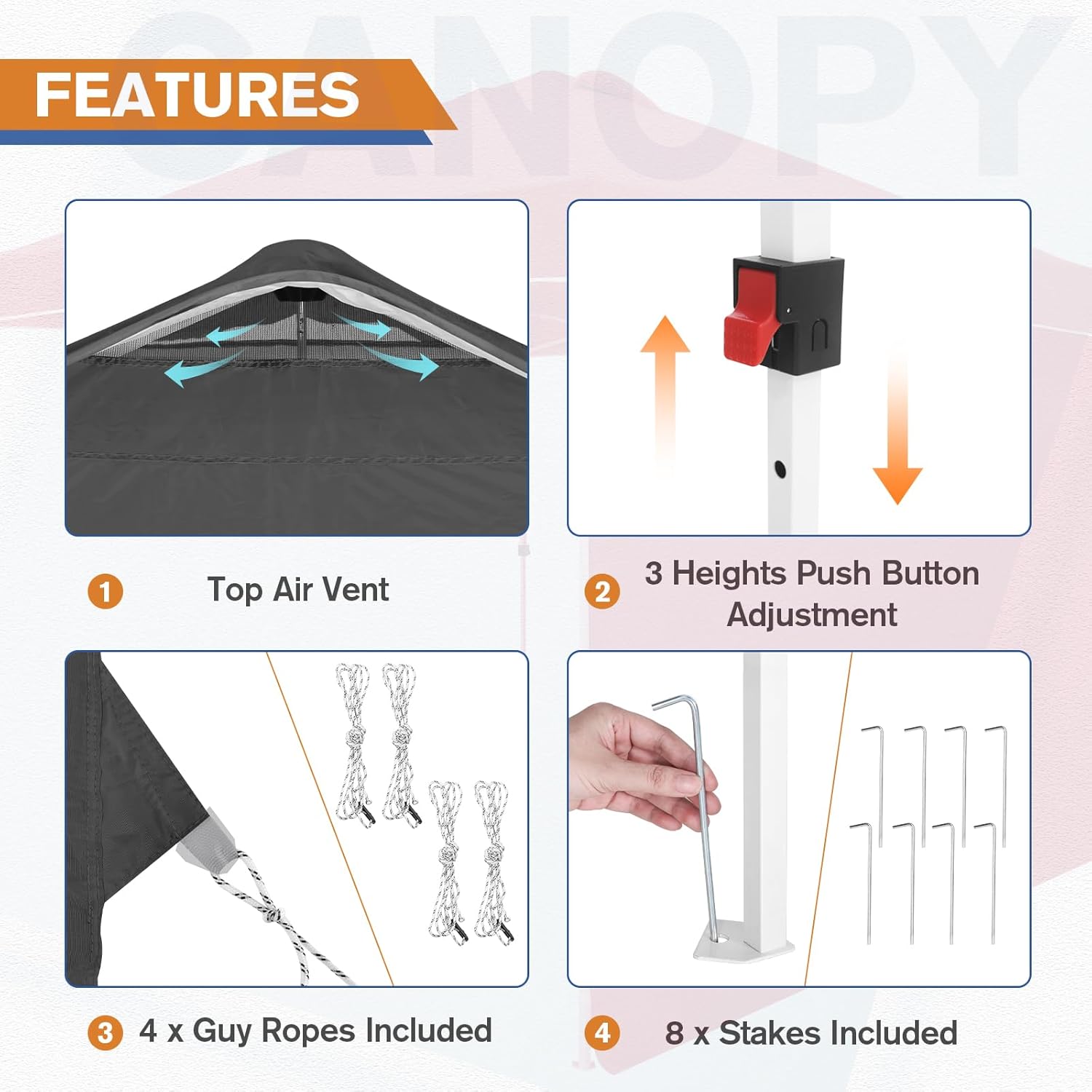 - EASY SETUP: This easy setup pop up canopy tent features the Peak Push system, a patented canopy center lock. The portable canopy requires no tools and easily opens and closes from the center in seconds. Its unique canopy tent center lock enables a quick, one person setup, letting you maximize outdoor time with minimal effort.