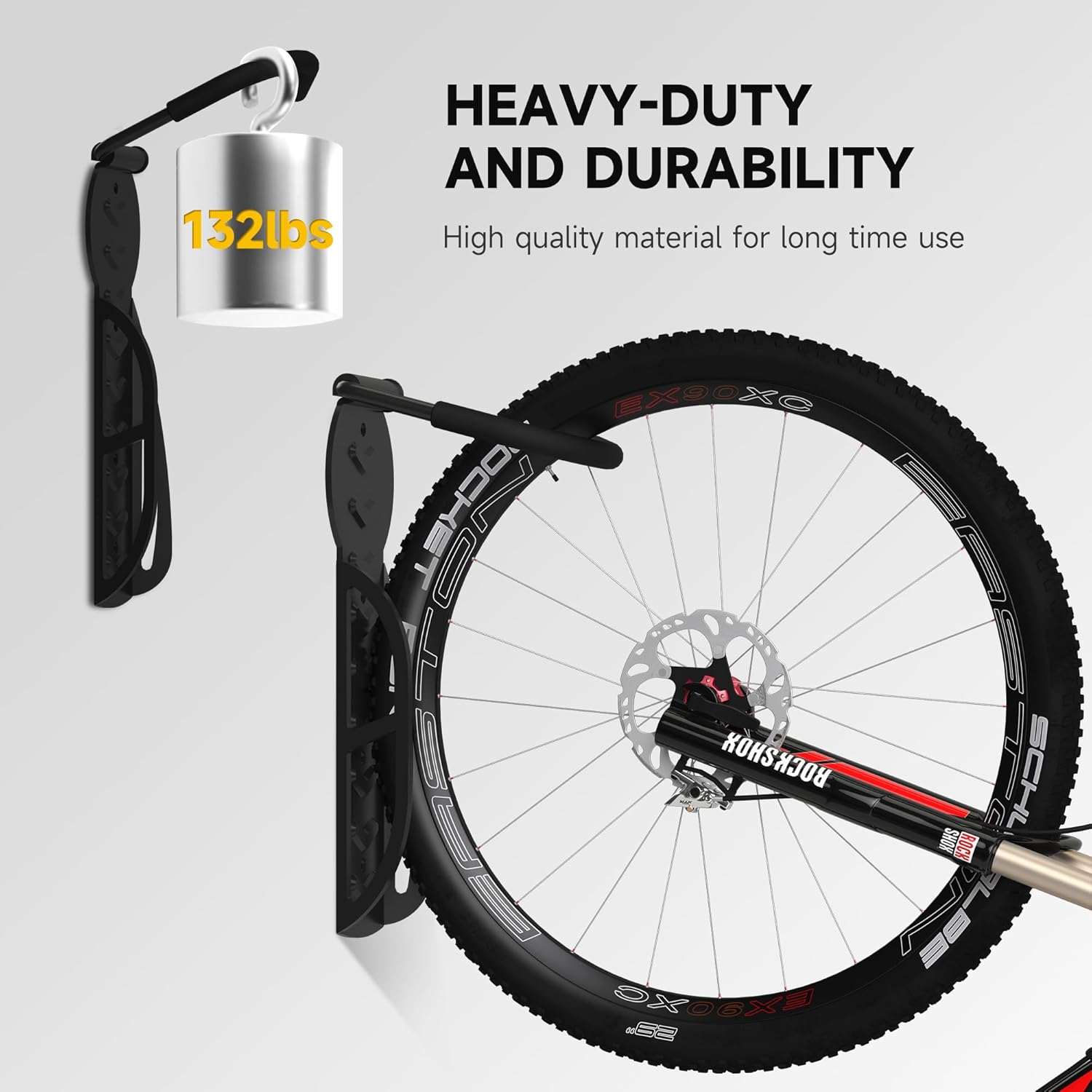 - Heavy Duty: It's maximum hanging weight up to 132lbs. Strong enough for mountain bike, road bike, folding bike,kids bike etc.(Not for fat tire bike, Ebike with tire width over 2.7")
