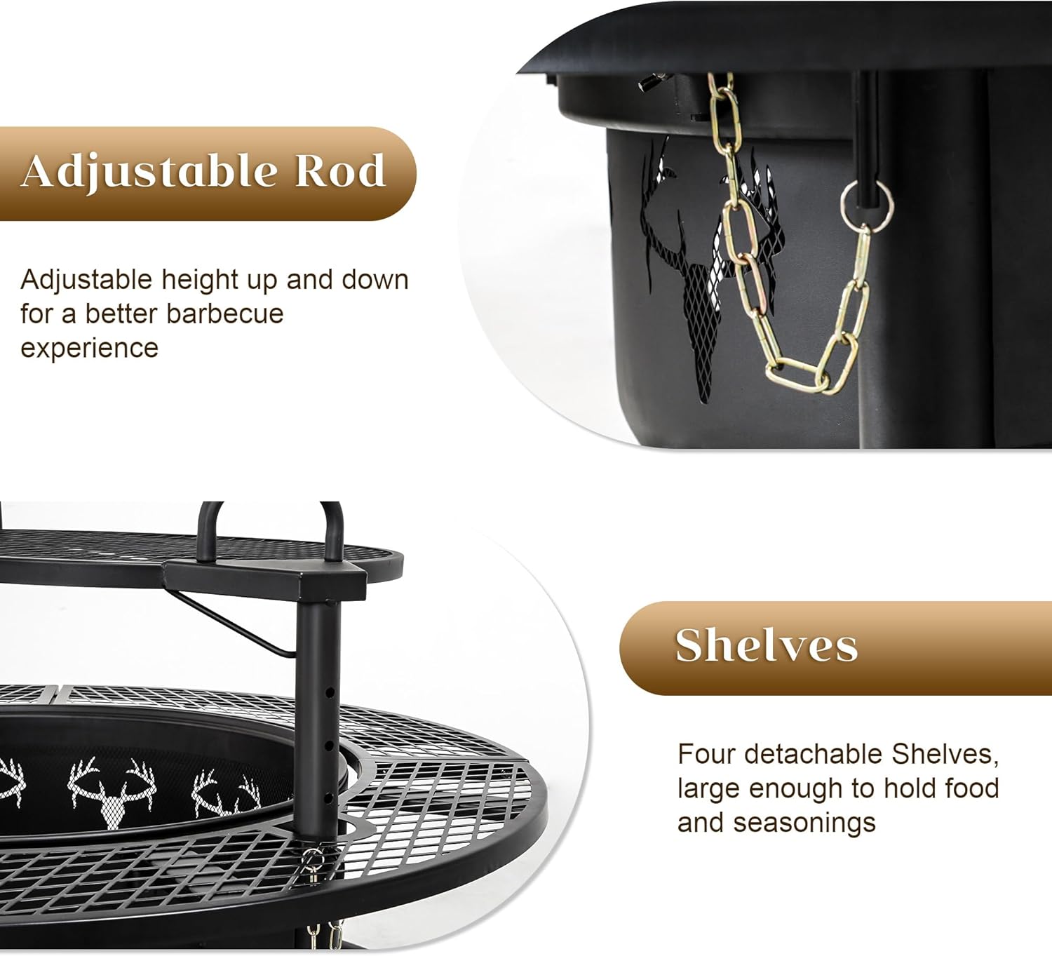 - Safe and Reliable: With built-in handles, the outdoor fire pit with grill can be easily rotated 360 degrees and adjusted up and down in height. And the stable round support structure makes wood burning fire pit safer to use. It provides a safe experience