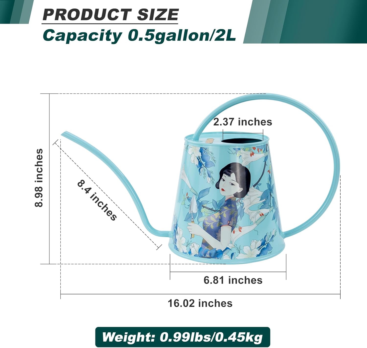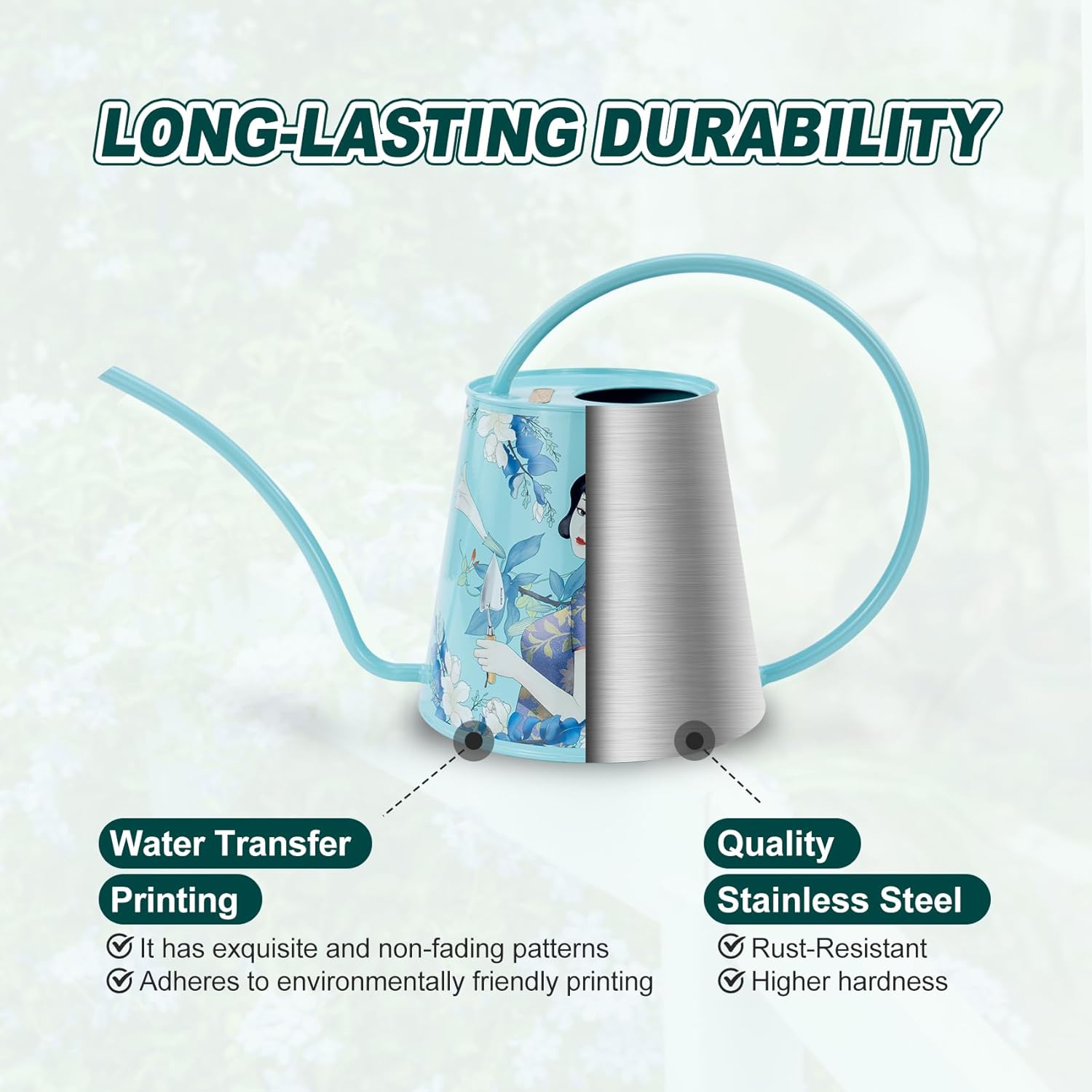 - [HIGH-QUALITY STAINLESS STEEL: This watering can is made of stainless steel. After many polishing surfaces, the smooth texture can resist daily scratches, corrosion and is not easy to rust. The curved handle with no sharp edges makes it easy and comfortable to carry around one-handed even full. The welds around the bottom of the spout and around the two points where the handle connects to the body are attached well to prevent it from leaking.