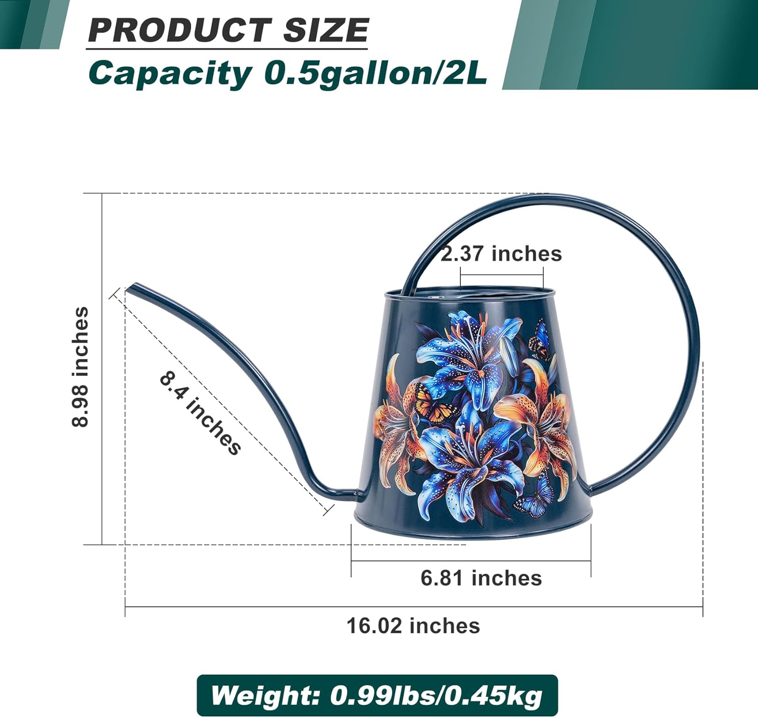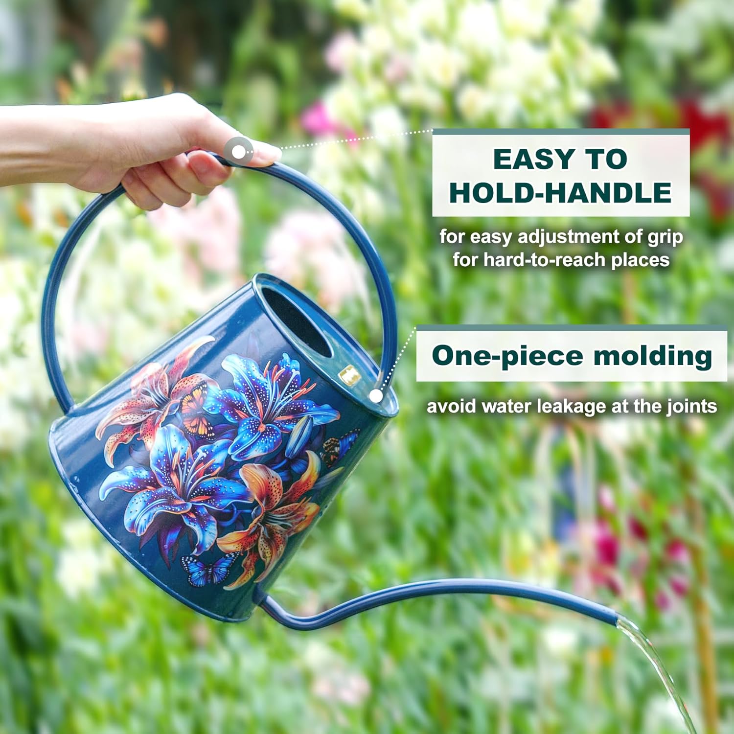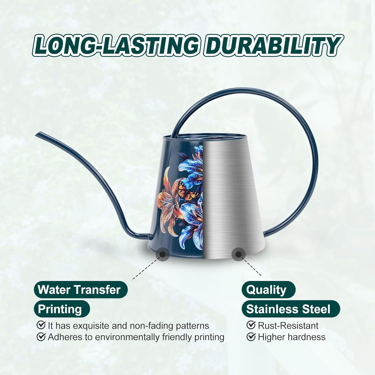 - [HIGH-QUALITY STAINLESS STEEL: This watering can is made of stainless steel. After many polishing surfaces, the smooth texture can resist daily scratches, corrosion and is not easy to rust. The curved handle with no sharp edges makes it easy and comfortable to carry around one-handed even full. The welds around the bottom of the spout and around the two points where the handle connects to the body are attached well to prevent it from leaking.