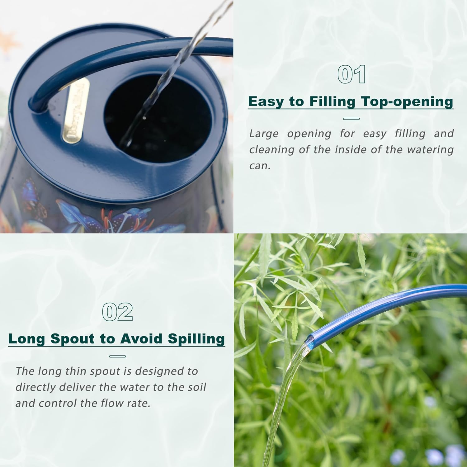 - MAKES IT EASY TO IRRIGATE: The 8.4-inch long spout can accurately transport water directly into the soil, So it is easy to penetrate water to the bottom of plants without splashing and wasting, Perfect for hanging plants, wall-mounted plants or general house plants. The semi-open top design of this stainless steel sprinkler makes it easy to add water and clean the jug . Water your plants quickly and easily to keep them healthy and thriving.
