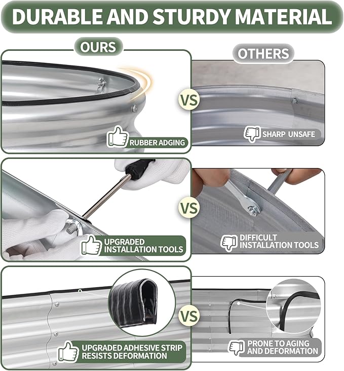 - 【High-Quality Materials & Durable】 Made from 0.5mm galvanized metal panels with double-layer anti-corrosion galvanization, this outdoor raised garden bed features a robust oval-shaped design for added strength and durability. Resistant to rust and corrosion, it provides a long-lasting gardening solution that can be reused for many years, ensuring a sustainable and reliable space for your plants to thrive.