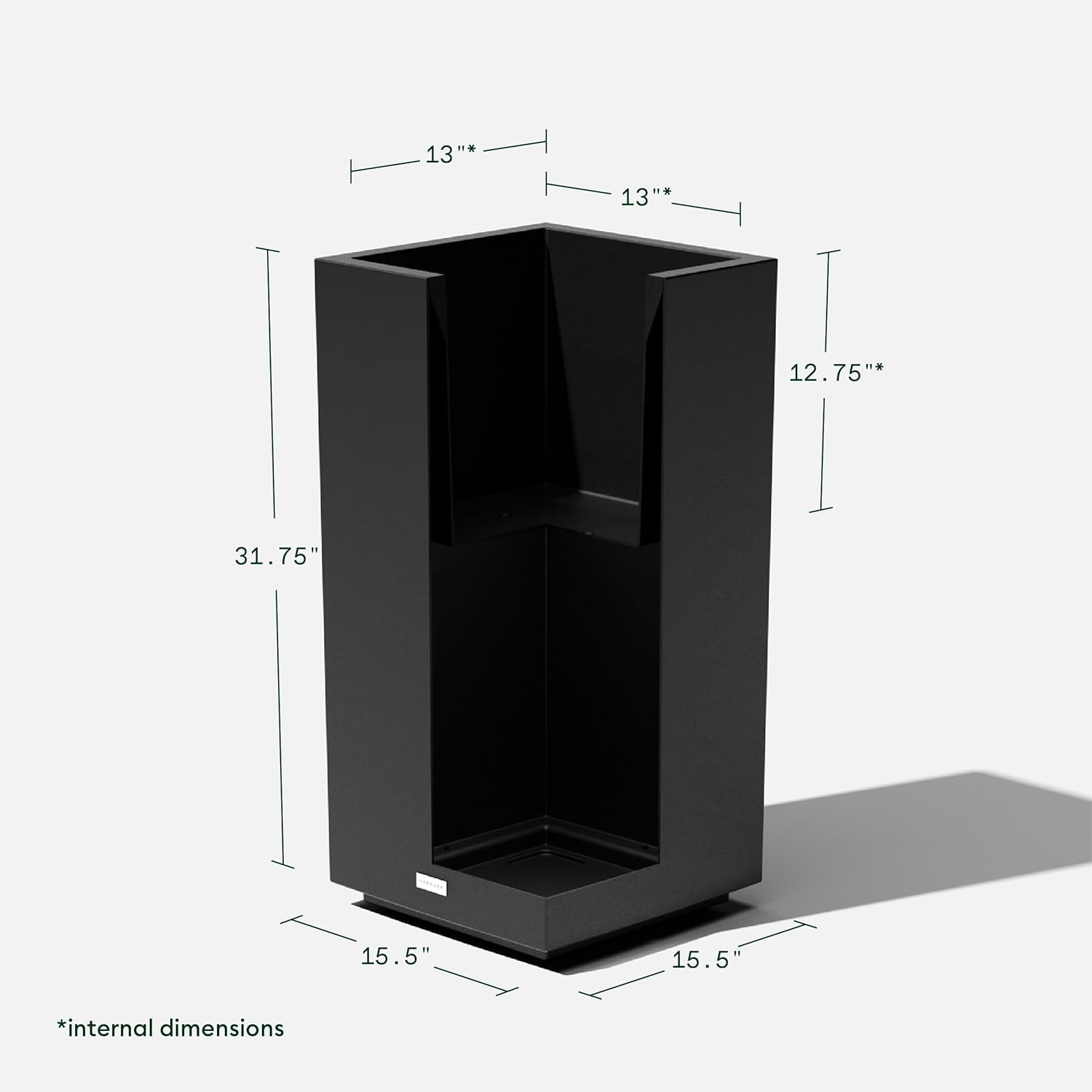 - DIMENSIONS & DETAILS: This double-walled planter’s exterior dimensions measure 31.75” in Height, 15.5” in Width, 15.5” in Length. With the removable insert bucket installed, the interior dimensions measure 12.75” in Height, 13” in Width, 13” in Length. It comes fully assembled for easy use