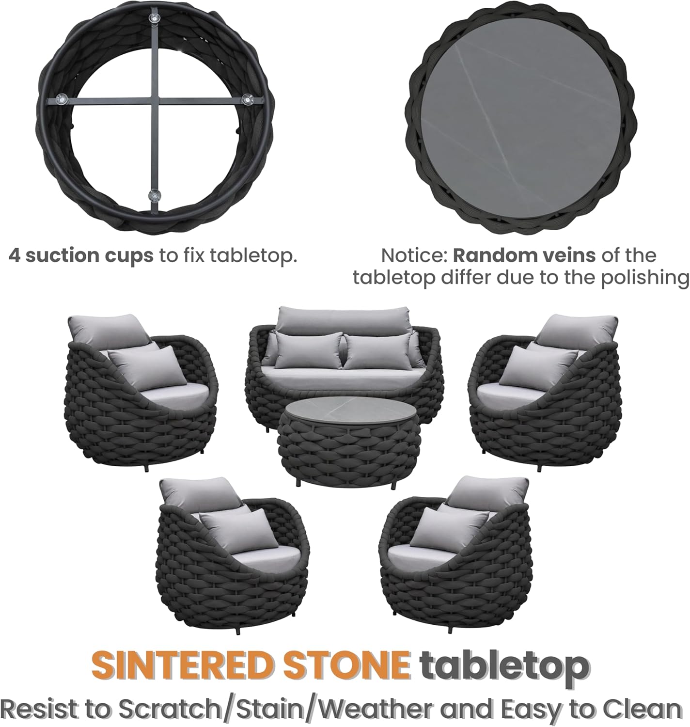- Furniture set is crafted from reinforced rust-free aluminum alloy frame, wrapped in hand woven textilene rope. The 6 pieces all weather patio upholstered conversation set resists to UV, rain, wind, salt water. Perfect for indoor outdoor even arid or coastal areas