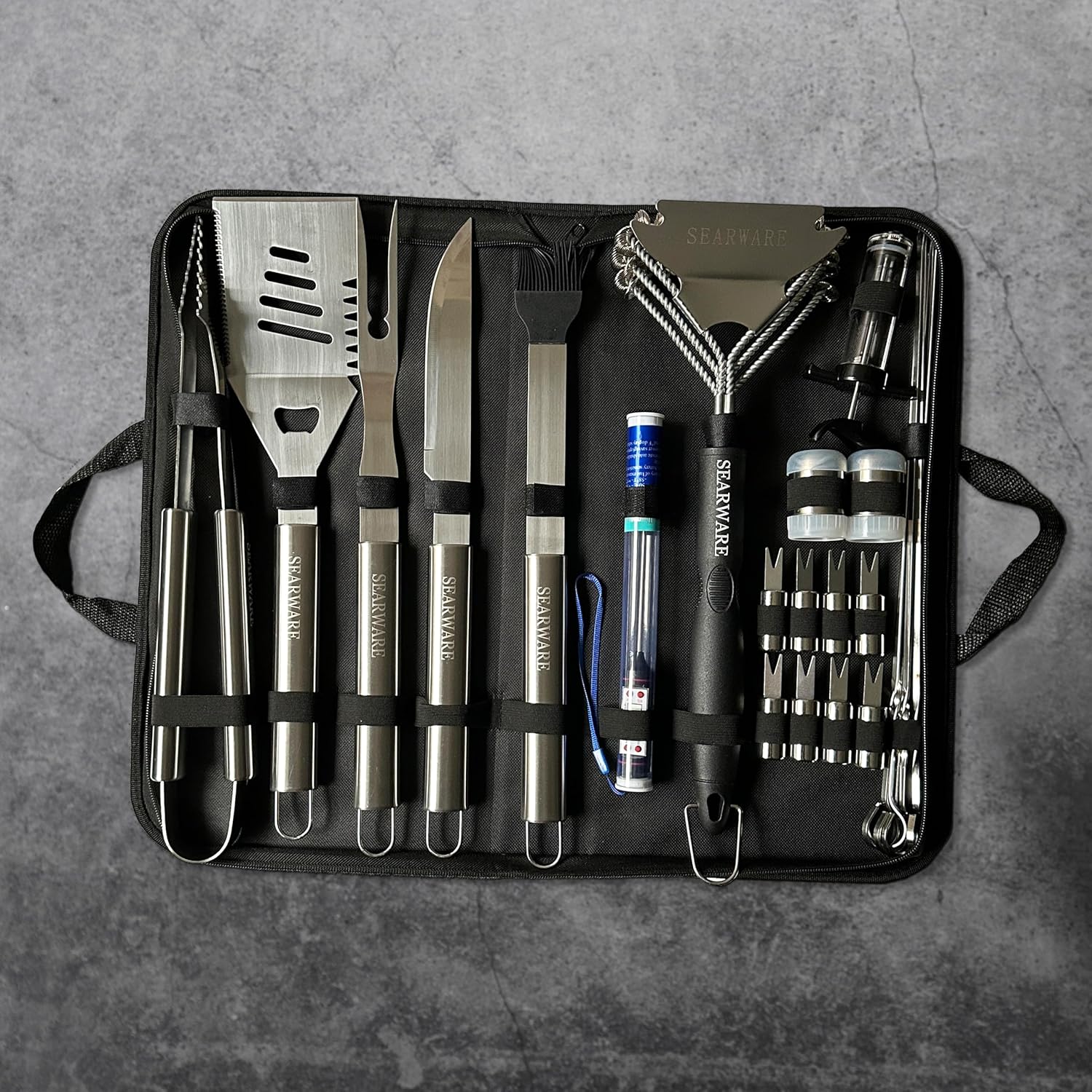 - Included Components : 1 spatula, 1 pair of tongs, 1 grill fork, 1 grill knife, 1 bristle free grill brush, 1 basting brush, 1 thermometer, 1 meat injector, 1 grill glove, 1 salt shaker, 1 pepper shaker, 8 corn skewers, and 6 kebab skewers. 1 spatula, 1 pair of tongs, 1 grill fork, 1 grill knife, 1 bristle free grill brush, 1 basting brush, 1 thermometer, 1 meat injector, 1 grill glove, 1 salt shaker, 1 pepper shaker, 8 cor… See more
