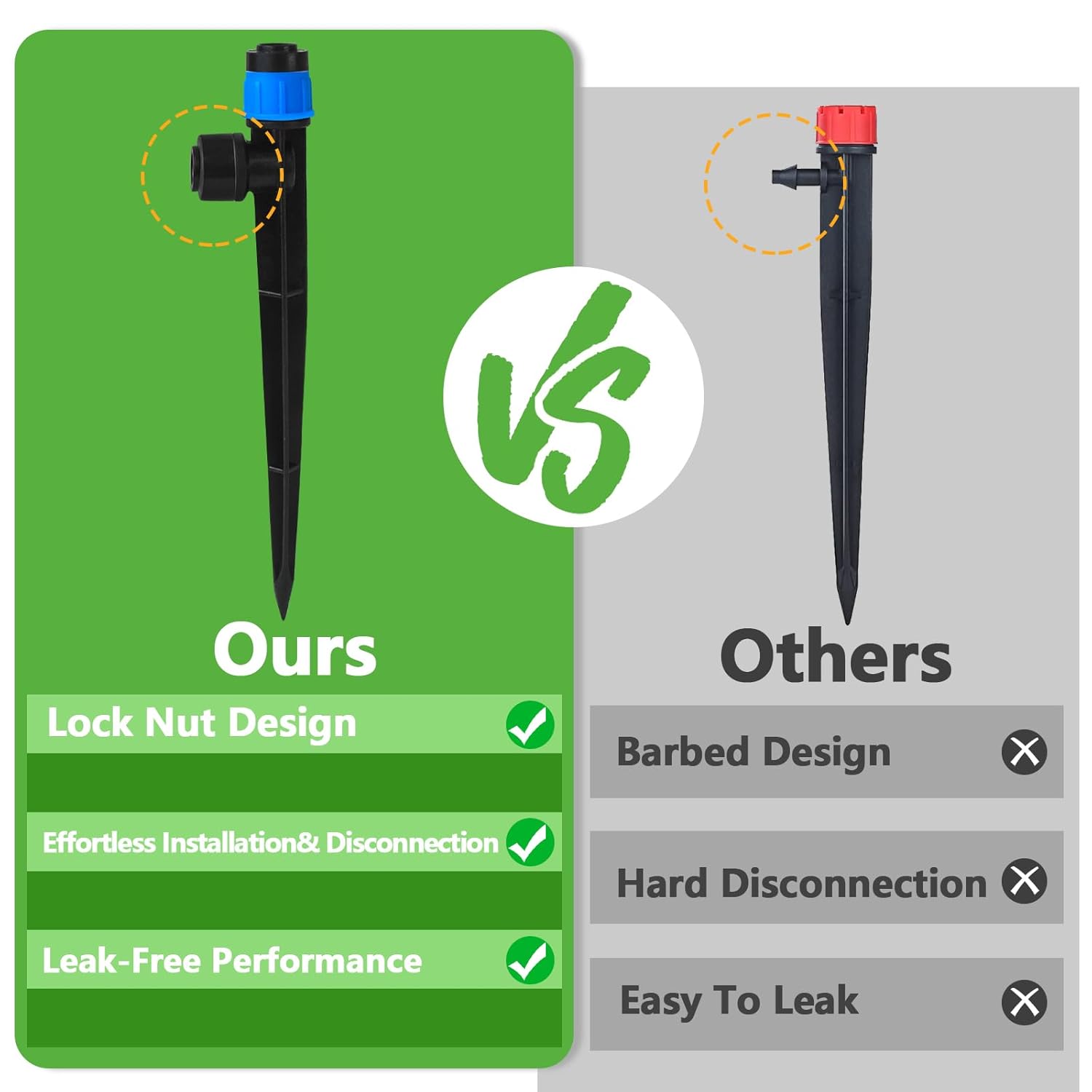 - 【Universal Compatibility】Our quick connect drip irrigation emitters fit seamlessly with all types of 1/4" irrigation tubing, ensuring a smooth and hassle-free installation. Designed for your convenience, our drip irrigation sprinkler heads feature a one-touch pull-out function, making it incredibly easy to install, remove, or reposition the tubing without any tools or excessive force. Plus, our detachable irrigation emitters are straightforward to clean, ensuring maintenance is a breeze and your system remains in top condition