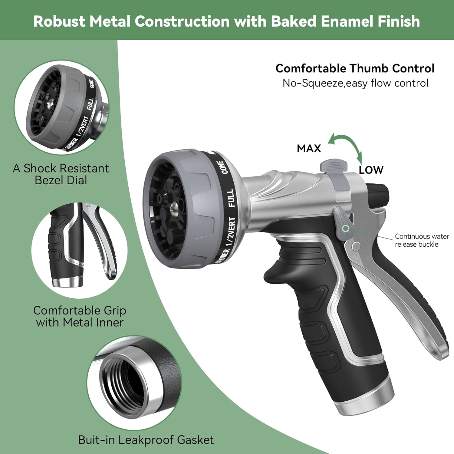 Garden Hose Nozzle, Heavy Duty Metal Water Hose Nozzle with 8 Adjustable Spray Patterns, High Pressure Hand Sprayer with Flow Control for for Garden Watering, Car & Pet Washing