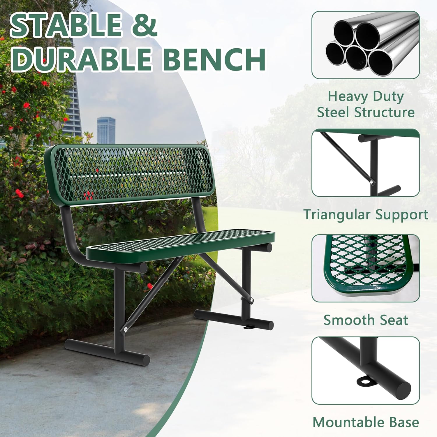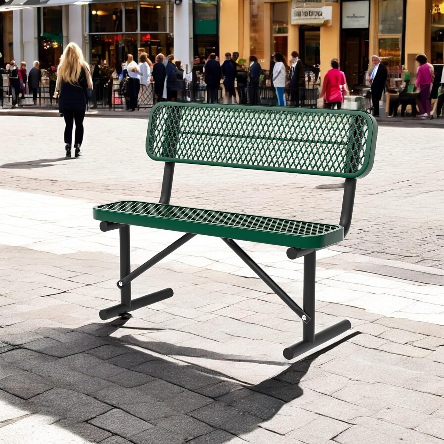 4FT Heavy Duty Park Bench with Back Portable Frame, Outdoor Steel Bench with Backrest, Green Park Bench Expanded Metal Mesh Bench for Lawn, Park, Deck, Garden, Patio, Porch (Green, 4FT)