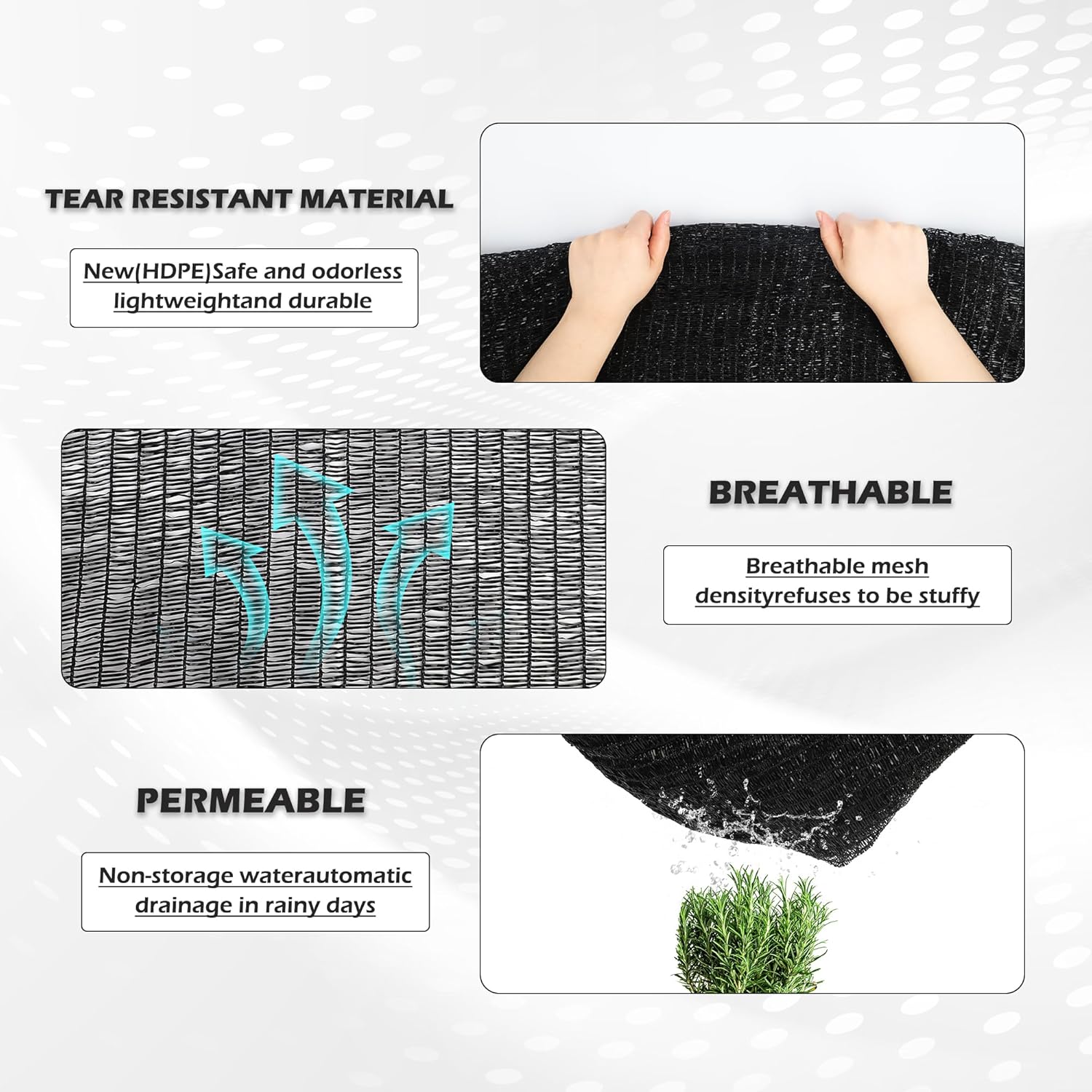 - High-Quality Material: Crafted from high-density polyethylene (HDPE), our shade cloth is lightweight yet exceptionally durable. The material ensures maximum airflow and flexibility, making it suitable for year-round use. It offers excellent protection in summer and winter, perfect for greenhouses, gardens, and outdoor living spaces.