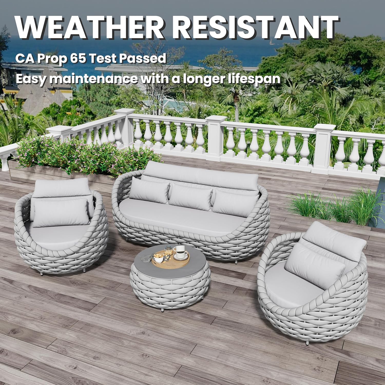 - Furniture set is crafted from reinforced rust-free aluminum alloy frame, wrapped in hand woven textilene rope. The 4 pieces all weather patio upholstered conversation set resists to UV, rain, wind, salt water. Perfect for indoor outdoor even arid or coastal areas
