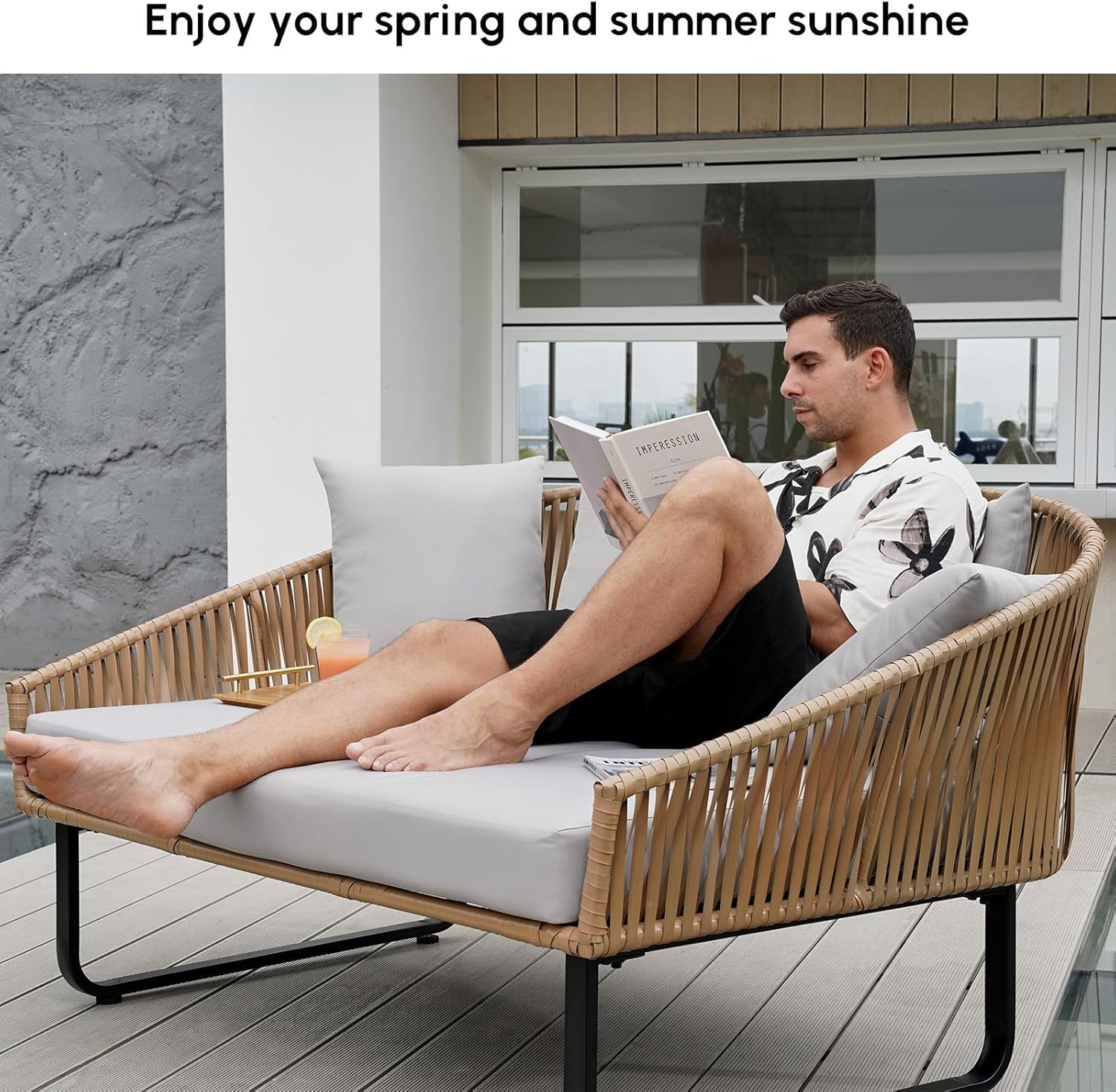 homary Rattan Patio Outdoor Daybed, Rattan Day Bed with Cushion Pillow & Aluminum Frame Sunbed Sofa Set Patio Loveseat,Gray