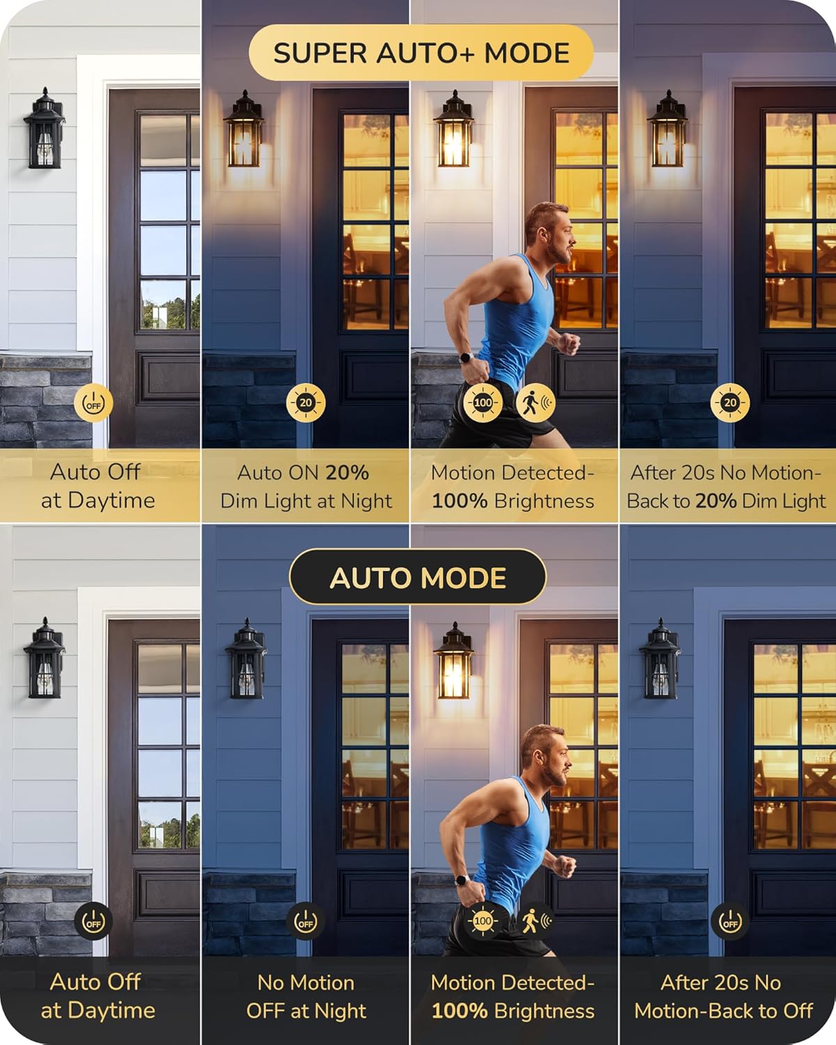 - [Upgrade 3 Lighting Modes] Outdoor wall sconce with 3 modes available, ① Auto+: 20%-50% brightness at night, 100% light once motion detected, 20-180s no motion back to 20%-50% dim light; ② Auto: off at daytime, auto on 100% light when motion detected, auto off after 20-180s no motion; ③ PC: auto off at daytime, auto turn on at night