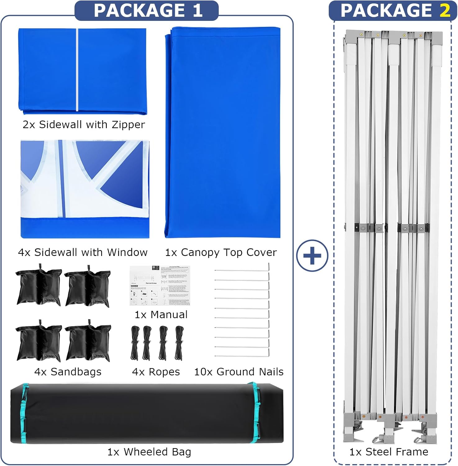 - 【What Will You Get】1x 13x26 Commercial Pop-up Canopy Frame, 1x 13x26 Canopy Top Cover, 6x PU coated SideWalls(4x SideWalls with Window and 2x SideWalls with Zipper), 4x Sandbags, 10x Ground Nails, 4x Ropes, 1x Wheeled Bag, 1x Manual. NOTE:We will divide the frame and other things into two boxes to ship. If you have any problems and questions, please feel free to contact us, we will give you the best service.