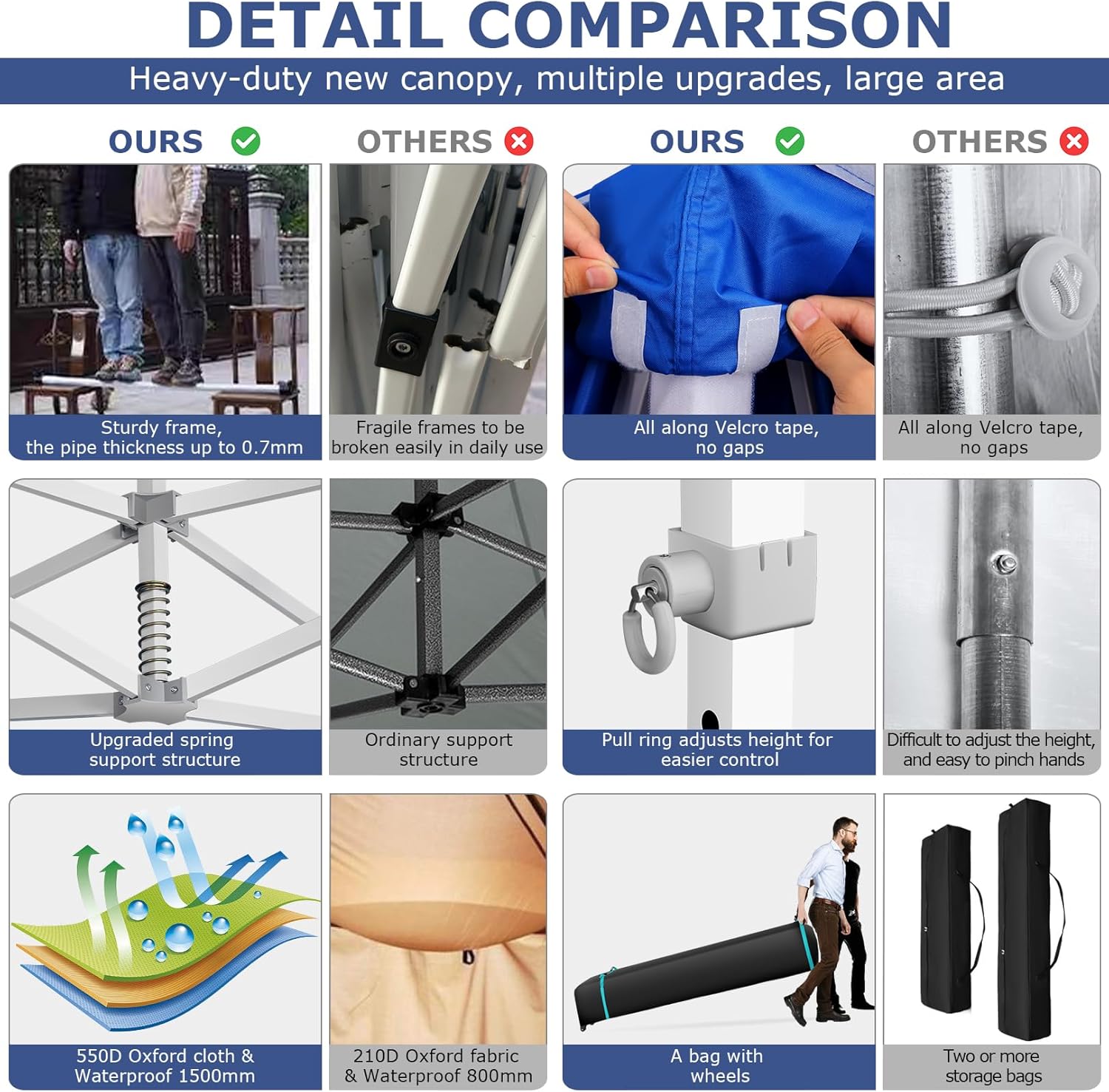 - 【Heavy Duty Steel Frame】After testing, the frame of 13x26 pop up canopy can withstand the weight of at least 9 adults. The thickness of the legs of the upgrade frame reaches 0.6mm, and the top pipe is upgraded to 0.7mm, which provides superior stability and durability. Using the included sandbags, ropes and nails, the outdoor canopy can withstand the wind speed of 30 miles/h.