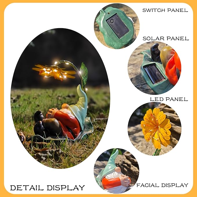 - 【Charming Design】: This whimsical resin gnome lies on a large green leaf, wearing a light-green hat and using a big yellow stamen as a sunshade. Its decorative, funny face and artistic details add a heartwarming touch to any garden or flower bed.