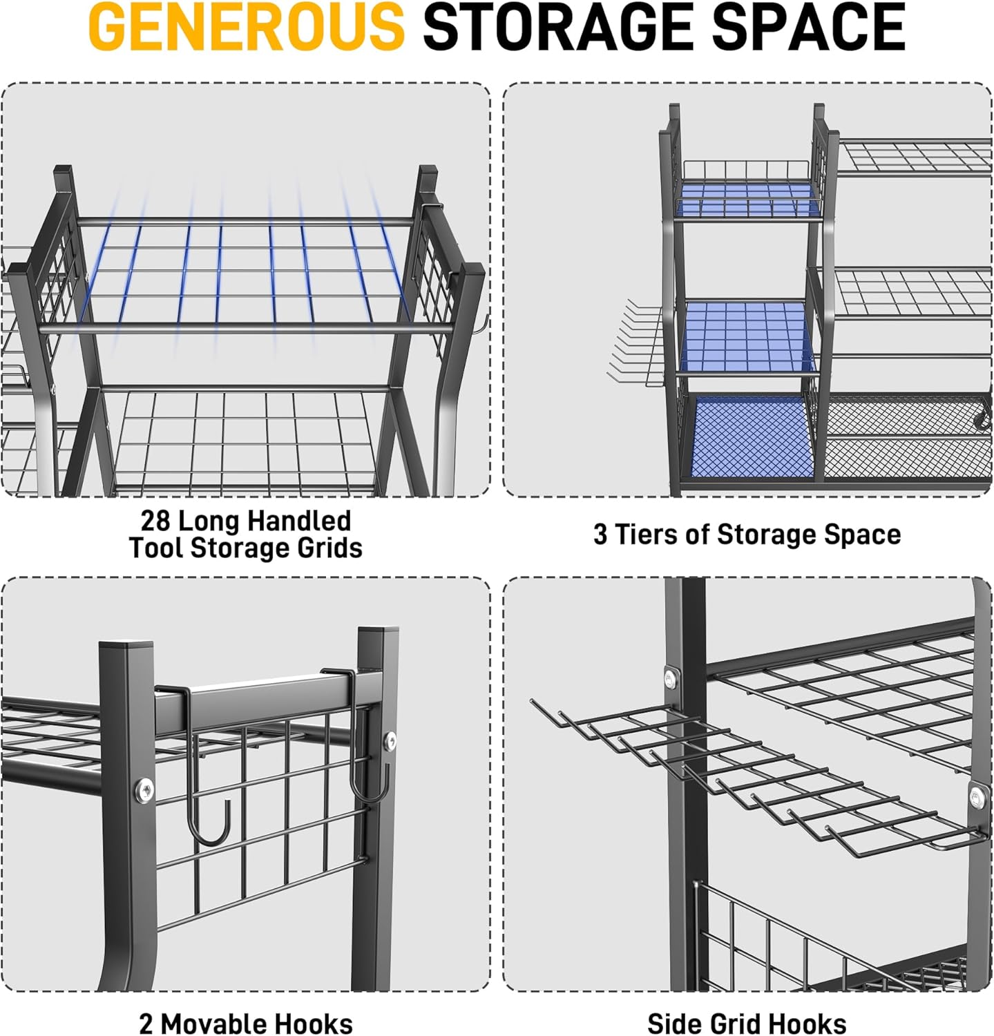 - Multi-Functional Storage Solution: This yard holder offers 3 shelves for small tools, a vertical structure with slots for long-handled tools like shovels and rakes, and hooks for hanging additional items, ensuring versatile and efficient storage