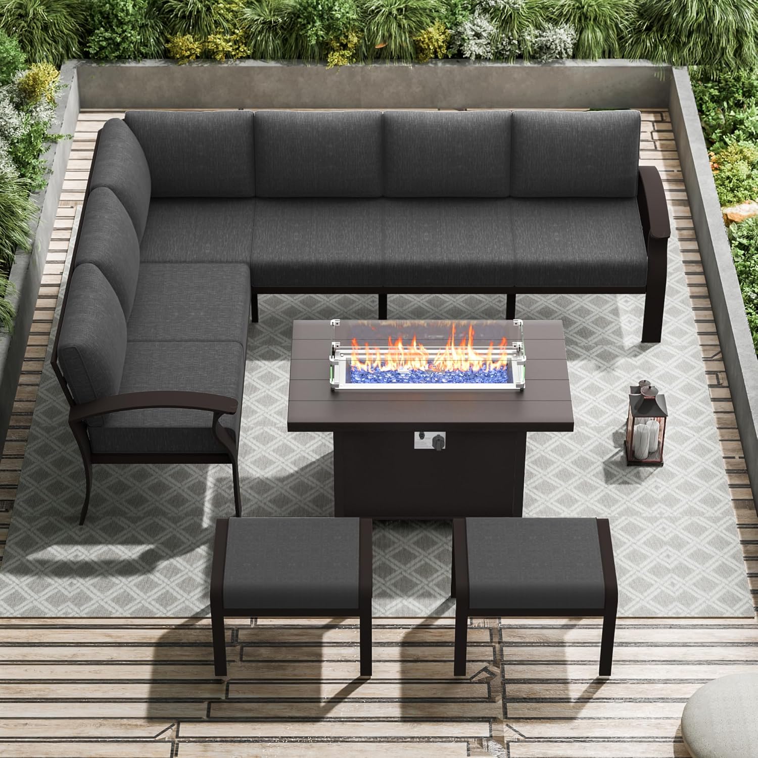 - OUTDOOR FURNITURE: Aluminum patio Furniture set including 1 six-seat corner sofa, 2 ottomans, 1 fire pit table. Patio furniture set has a variety of chairs for different scenarios of gatherings. This set consists of several parts, suitable for different scenarios of the party, you can according to their own preferences or needs for random combinations, and enjoy a happy time with your family and friends!