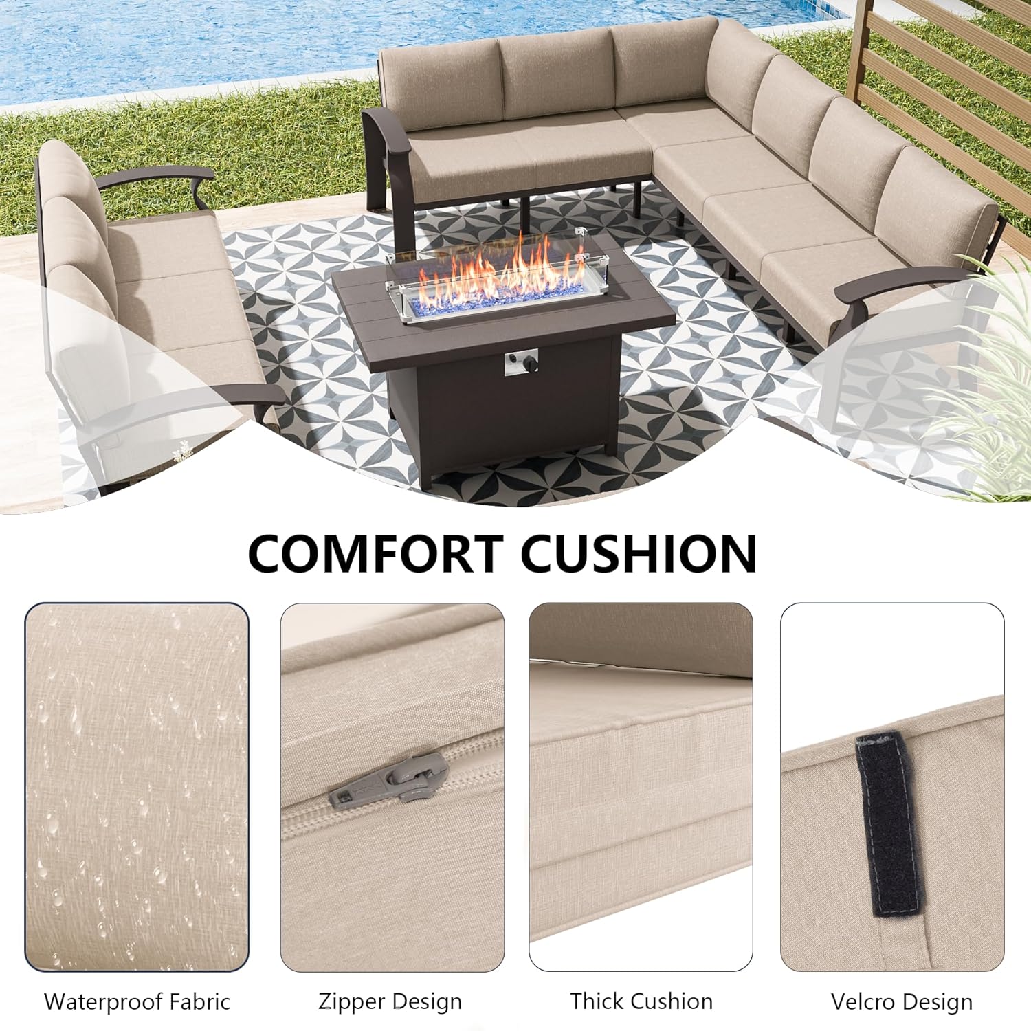 - UPGRADED CUSHIONS: Seat cushions on outdoor patio conversation sets have been upgraded to 5.1 inches thick, which greatly improves comfort. Modern metal patio sectional sofa also has upgraded thicker back cushions. Cushion covers are spill resistant and can be removed and replaced for cleaning. Cushions have anti-slip fasteners that attach to the furniture to prevent slipping and falling off.