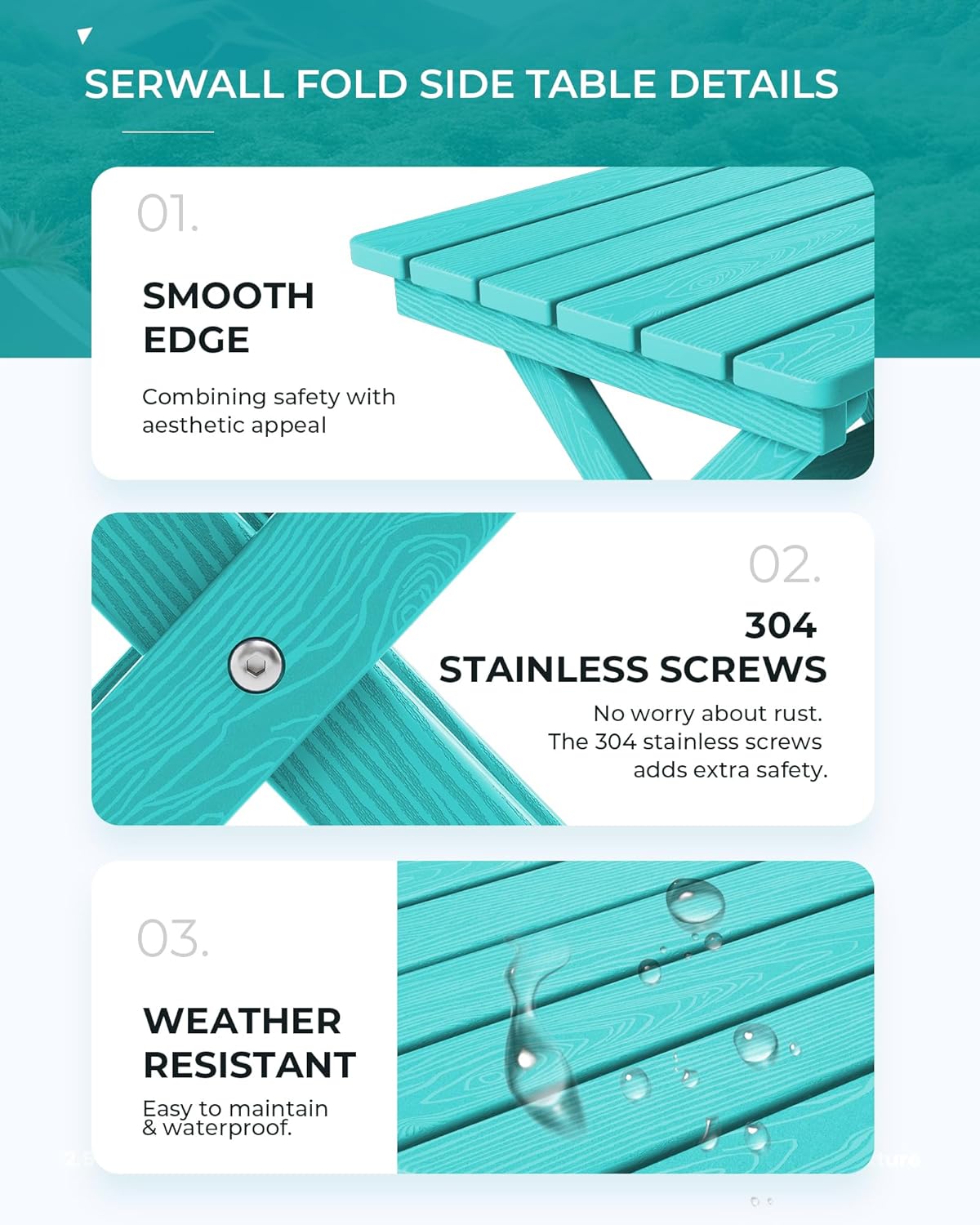- [Premium Wood-Textured Surface] Offering the aesthetic appeal of wood without the upkeep, the SERWALL Side Table features a wood-textured HDPE surface that adds an elegant and natural touch to your outdoor decor.
