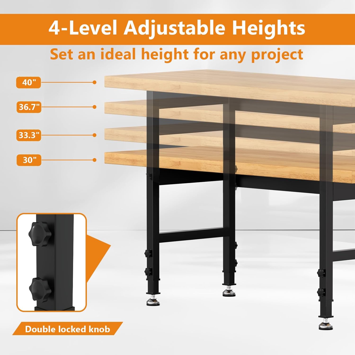 - Adjustable Height: This adjustable workbench features an easily adjustable height mechanism, allowing you to set the table height between 30" and 40". This flexibility ensures ergonomic comfort, whether you’re sitting or standing, and can be quickly adapted for different users and tasks, enhancing overall productivity and reducing strain during extended work periods.