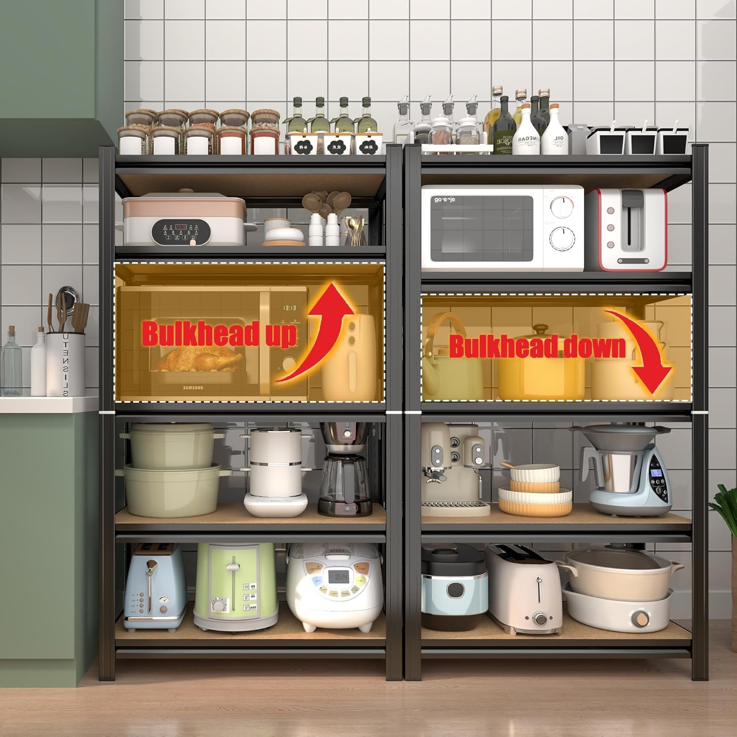 - 【 Fully Adjustable & Customizable Storage】 With 5 adjustable tiers, you can easily modify the shelf heights to fit items of all sizes—from tall kitchen appliances to small storage bins. The tool-free assembly allows quick setup, while the reinforced steel frame ensures a secure, wobble-free fit in any environment.