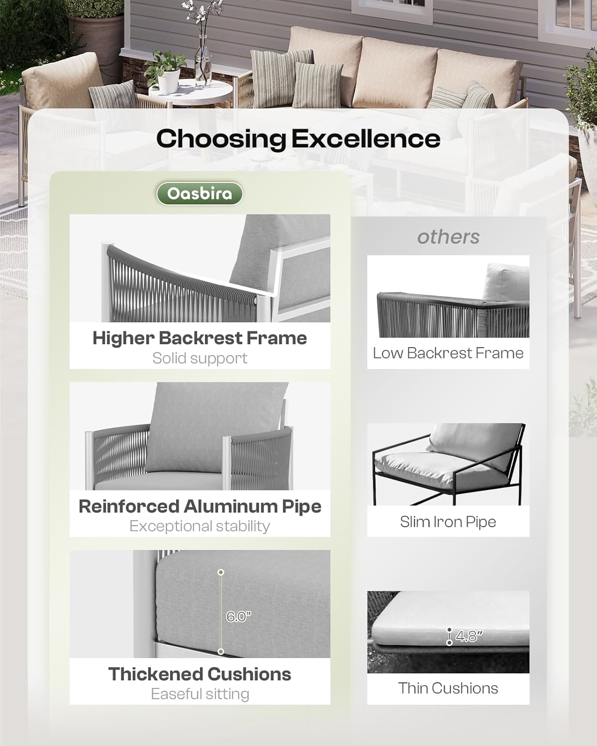 - 【Ultimate Comfort】 The cushions of the Oasbira patio furniture set are filled with honeycomb structure foam, offering exceptional comfort. This outdoor seating furniture features an elevated backrest frame reaching 29.4 inches, providing support that far beyond average patio sets. Each seat is 23.6 inches wide, offering ample space and ensuring ergonomic relaxation.