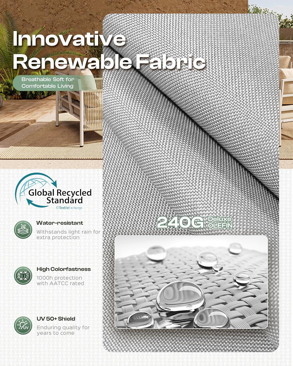- 【Durable Design】 The modern outdoor furniture features a superior all-aluminum frame that is far stronger and more durable than typical metal frame. And the anodized finish enhances durability and stability. It embodies all the exceptional qualities that an aluminum patio furniture set should have. The Olefin fabric combines durability with UV protection for years of outdoor enjoyment. The HDPE handcrafted rope has exceptionally high strength and toughness, offering greater load-bearing capacity than regular wicker, setting it apart from other wicker outdoor furniture.