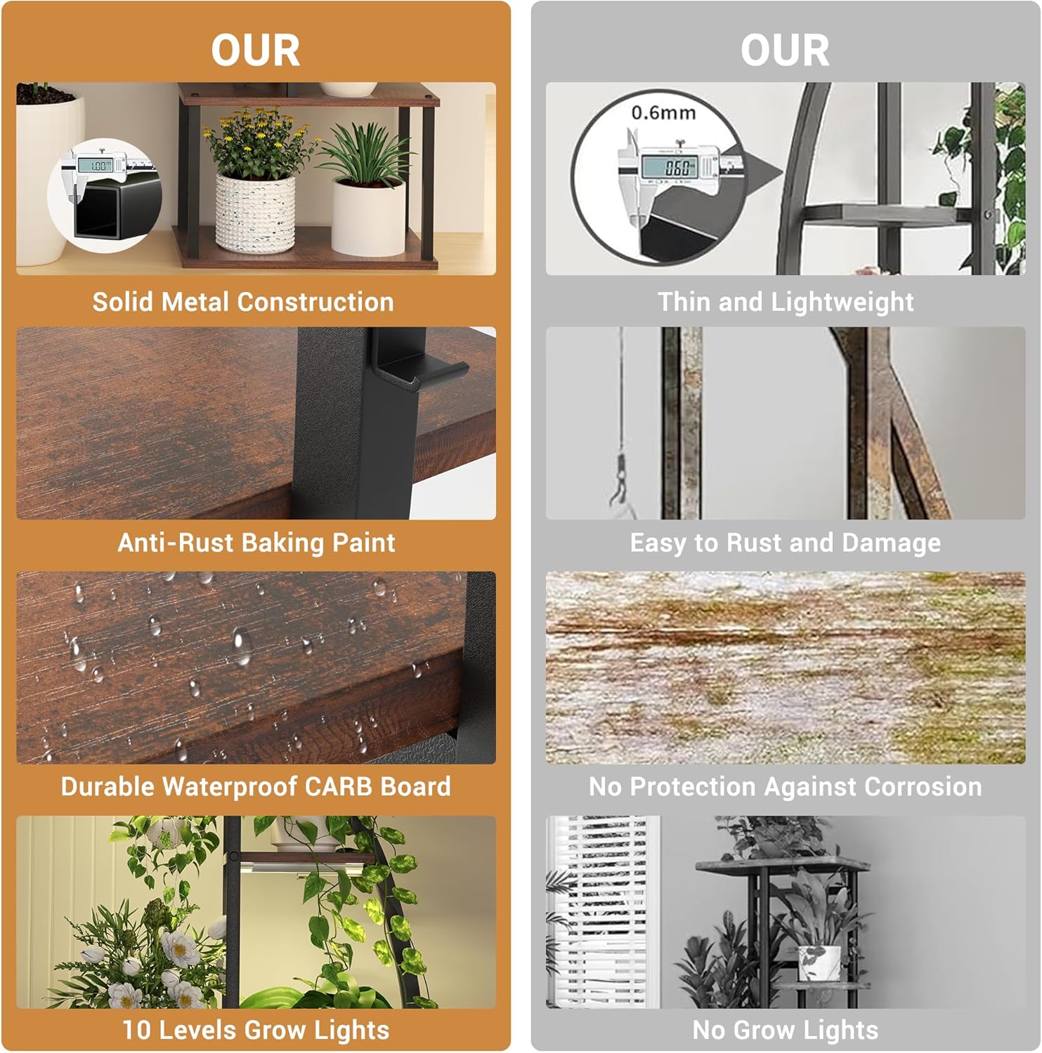 - 【Plant Stand with Smart Lighting Control】Our metal plant stand is equipped with a powerful full-spectrum grow light. Using advanced LED chips, 3 switch modes, 3H/9H/12H timing settings, and 10-level brightness adjustment, it offers diversified lighting options to meet the lighting conditions required by plants at different growth stages. The three-head plant lights ensure that plants on all levels can receive sufficient light. This plant shelf can be placed anywhere indoors, and there is no need to move plants outdoors to absorb light frequently.