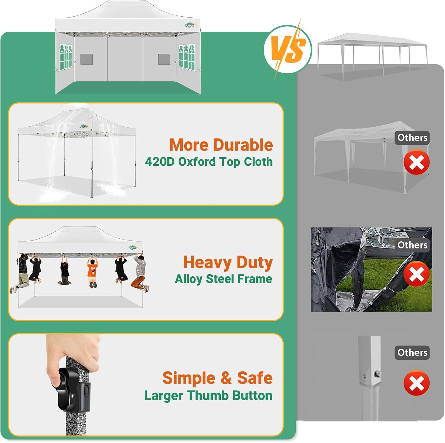 - ✅ 【Easy Assembly】Equipped with practical snap buttons, the 10x15 Pop Up Canopy can be assembled or disassembled by 2-4 people within minutes, without the need for tools. Choose from 3 height settings (222cm - 232cm - 240cm) to find the perfect height. The upgraded thumb latch system is easy to lock and release, ensuring finger protection against pinching.