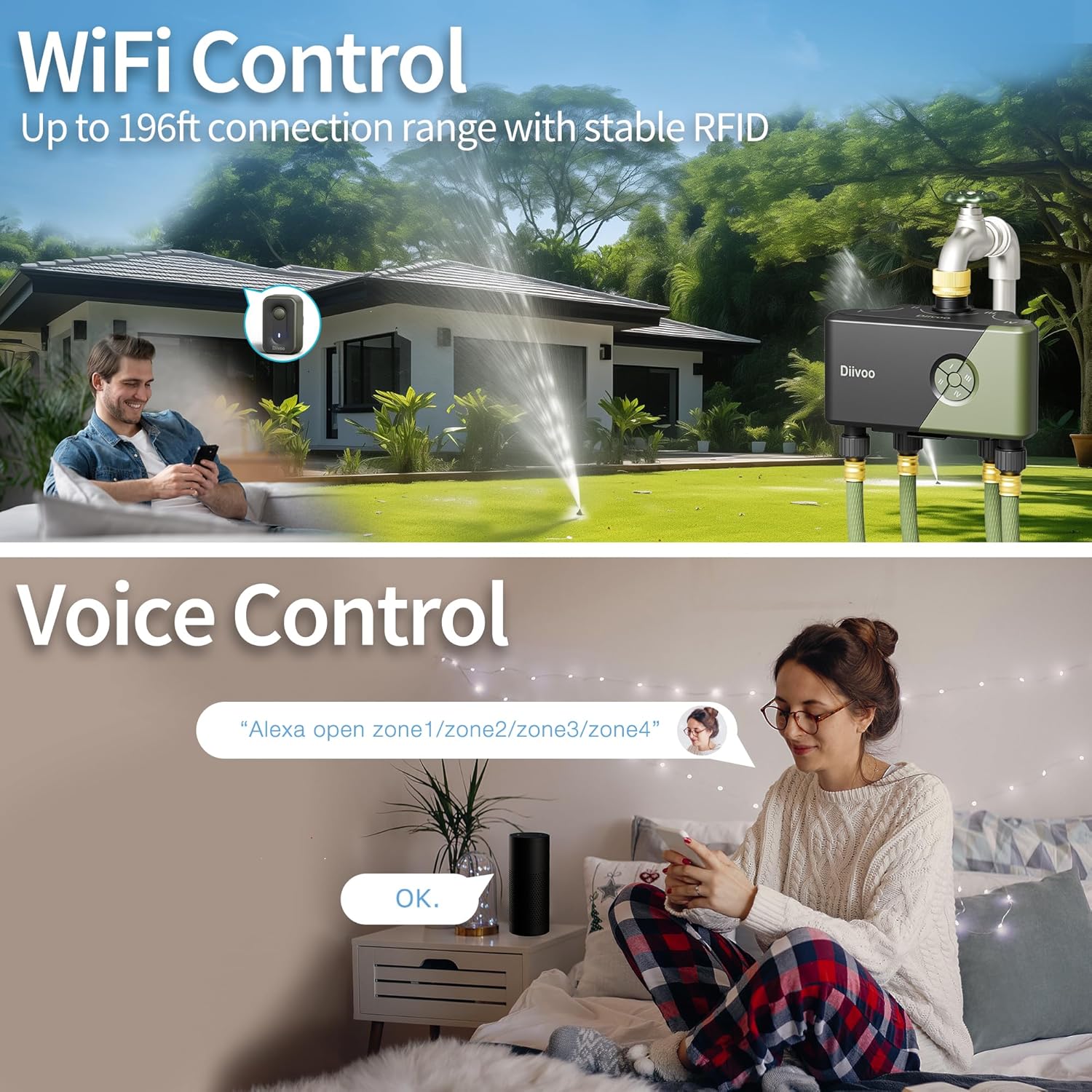 - Smart Control: With the HomGar app, you can add your Diivoo smart water timer to your WiFi gateway (only supports 2.4 GHz WiFi). Diivoo smart 4 zone hose timer is compatible with Alexa and Google Assistant to make your life easier by simplifying your irrigation efforts