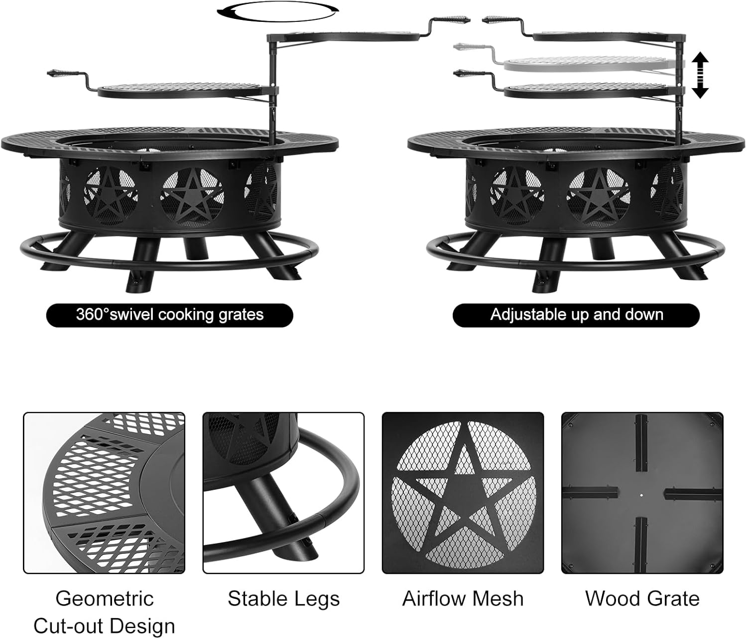- [Beautiful & Humanized Design]OutVue fire pit table comes with 2 height-adjustable and 360° swivel grills which disassemble freely. You can barbecue, keep food warm or put pan to cook on them. The side of wood-burning fire pit is created with classic stars cut-out design which catches firelight for creating fun shadows. The drilled design promotes airflow and keeps the fire strong. All sophisticated designs of the fire pits for outside are dedicated to the warmth and comfort for you.