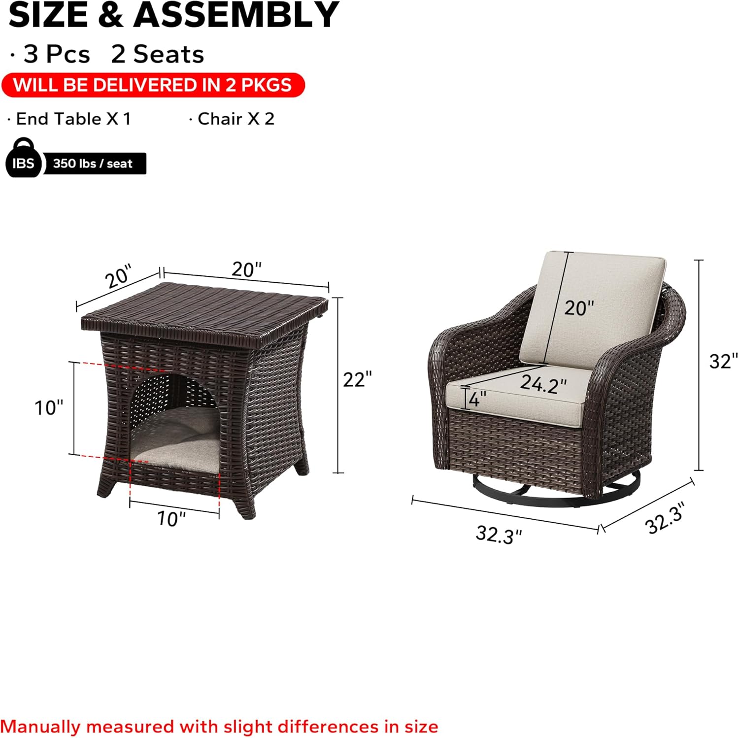- Packing Included: The 3 pcs set includes 2 x swivel rocker chairs, 1 x end table. The tools and instructions needed for installation will also be in the box.The 3 pieces patio dining set will come in 2 boxes. They may come in different days
