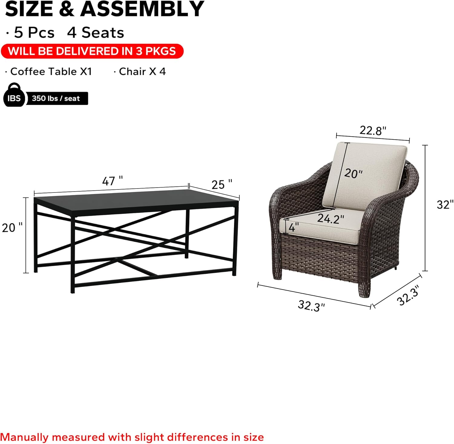 - Packing Included: The 5 pcs set includes 4 x swivel rocker chairs, 1 x coffee table. The tools and instructions needed for installation will also be in the box.The 5 pieces patio dining set will come in 3 boxes. They may come in different days