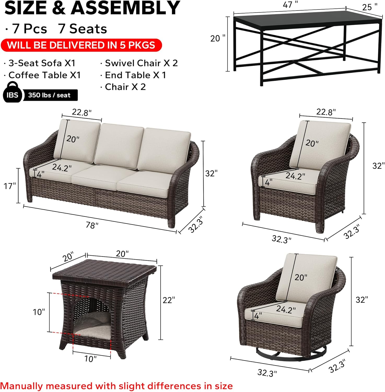 - Packing Included: The 7 pcs set includes 1x 3-seat patio wicker sofa, 2 x swivel rocker chairs, 2 x single armchairs, 1 x coffee table and 1 x end table. The tools and instructions needed for installation will also be in the box