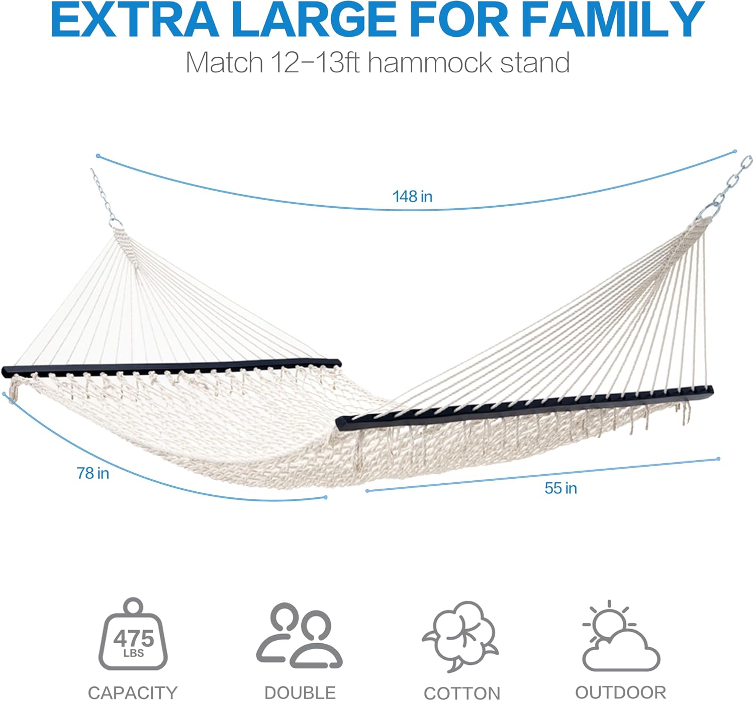 - Heavy-Duty Hardwood Spreader Bar:Built to last with industrial-grade components: reinforced stitching, weather-resistant galvanized steel chains (extra 9" length for flexible hanging), and splinter-free hardwood that withstands 475lbs. Endures years of sun exposure and outdoor elements. you can attach the hammock to a hammock stand or hang it between two trees.