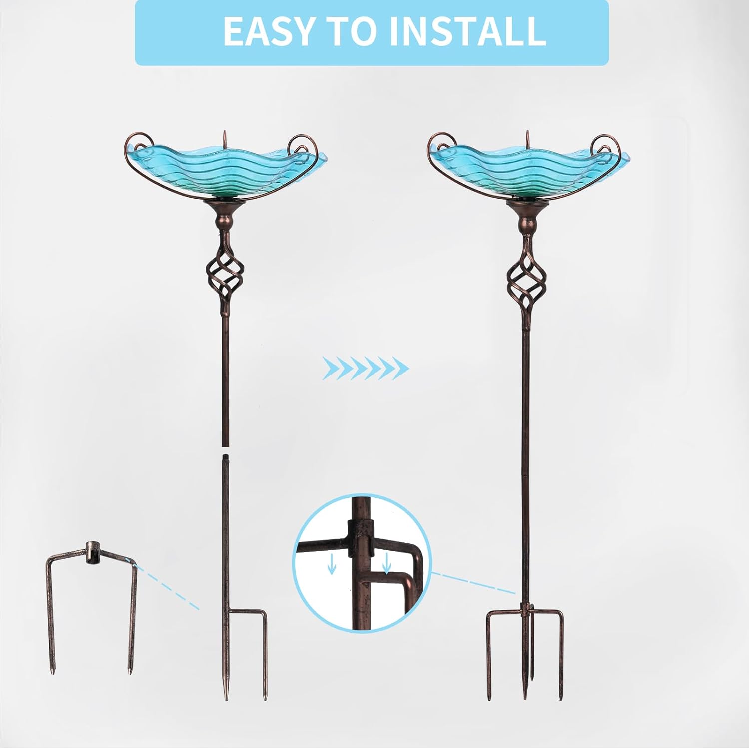 - Birdbath base with four-pronged bottom to add its more stability and make you move glass bird bath to place the perfect spot effortlessly, easy to assemble this blue birdbath