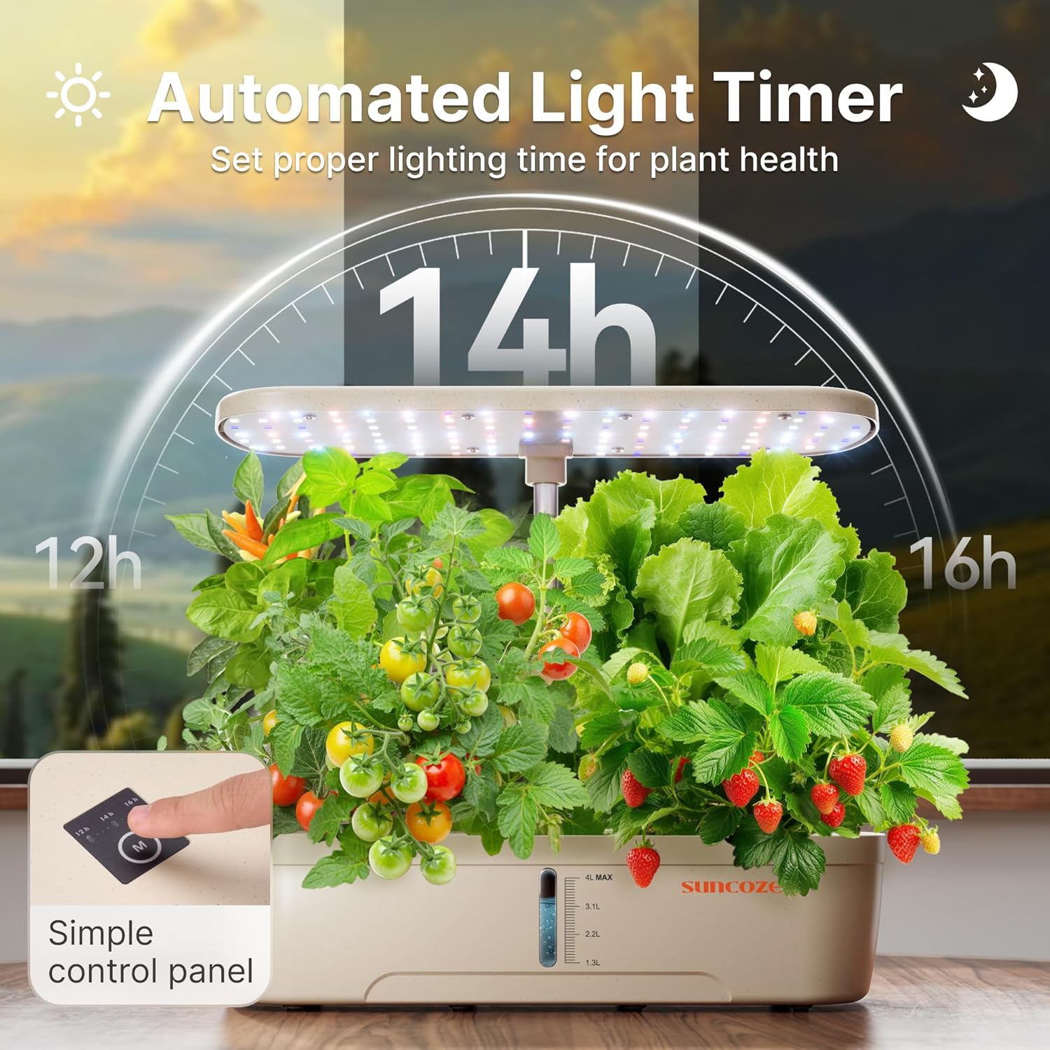 SUNCOZE Hydroponics Growing System Kit 12 Pods, Indoor herb Garden with 20W LED Grow Light, Visible Water Tank with Pump, 2.2"-12.4" Adjustable Height Indoor Gardening System, Gardening Gifts, Beige
