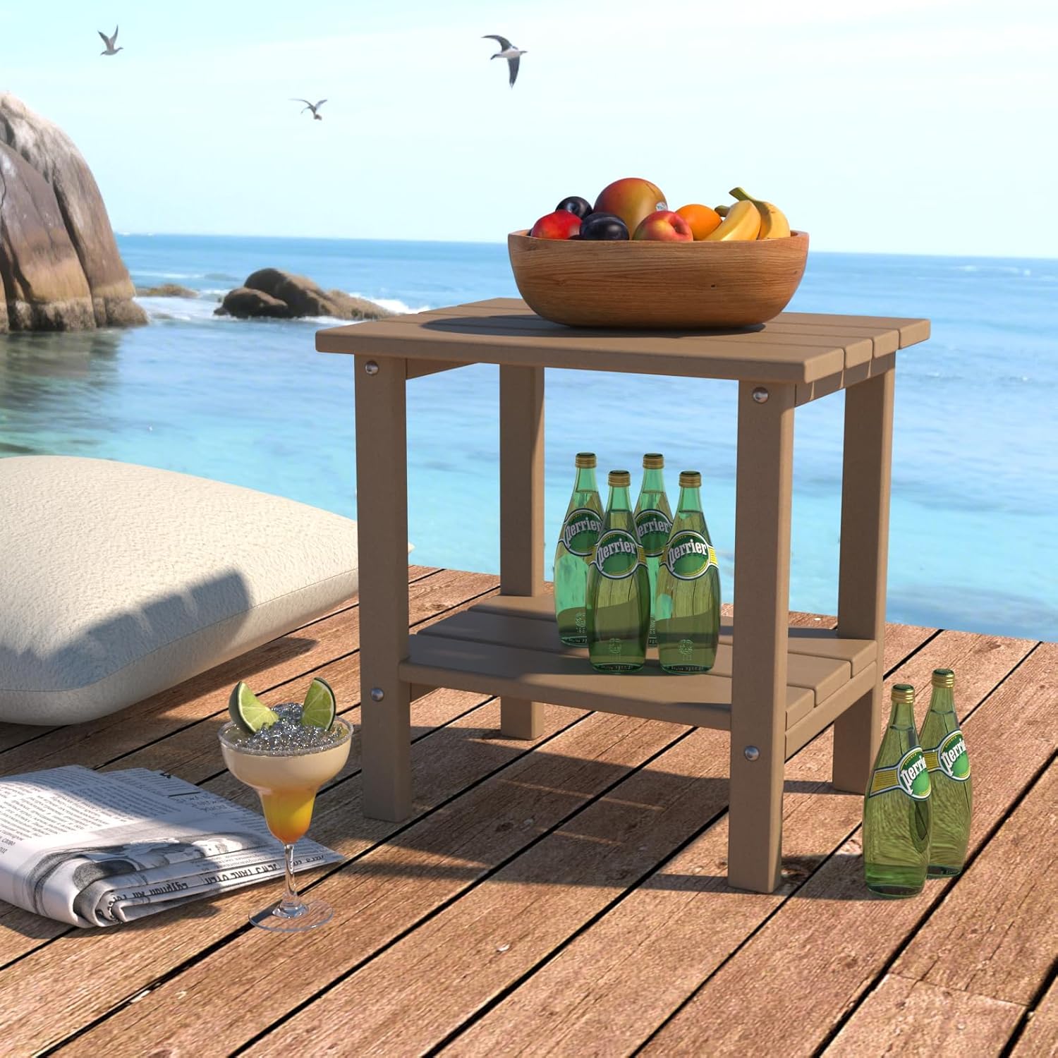 Outdoor Side Table, 2-Tier Adirondack Storage Patio Side Table, Weather Resistant Patio End Table for Backyard & Pool, Durable HDPE Small Outdoor Table, Brown