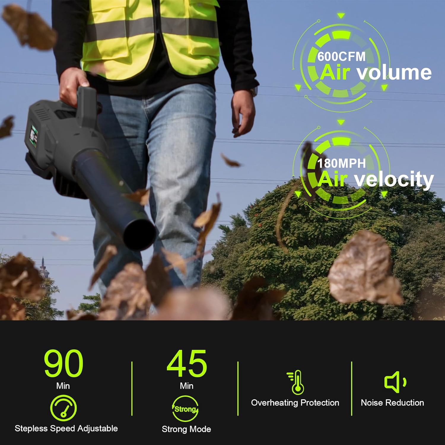 - Cordless Powerful Blower: Equipped with a robust 40V motor, this 40V leaf blowers for lawn care can provide a robust 600 CFM airflow and speeds of up to 180 MPH, 21000 RPM, making it the helpful tool for effective lawn care and debris removal