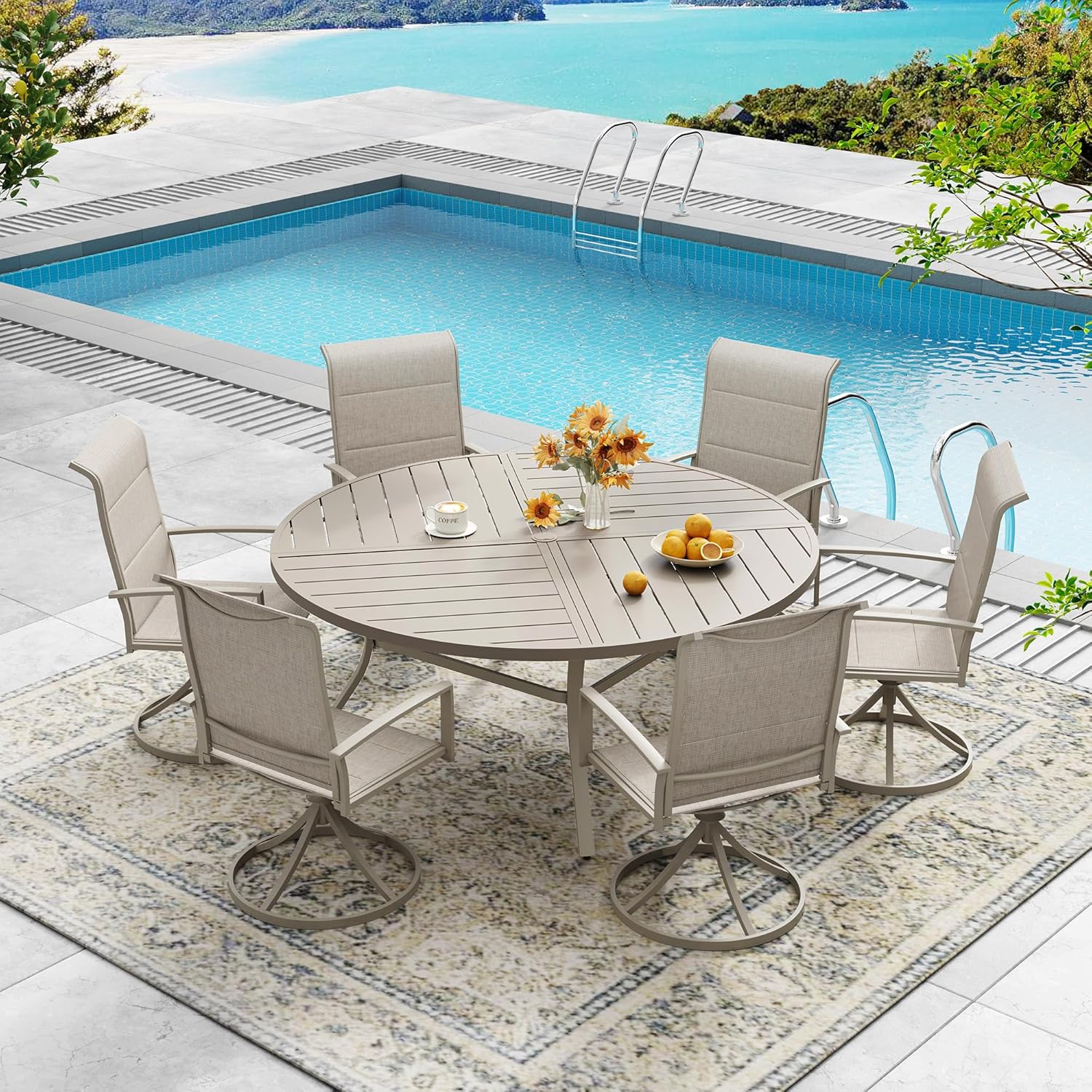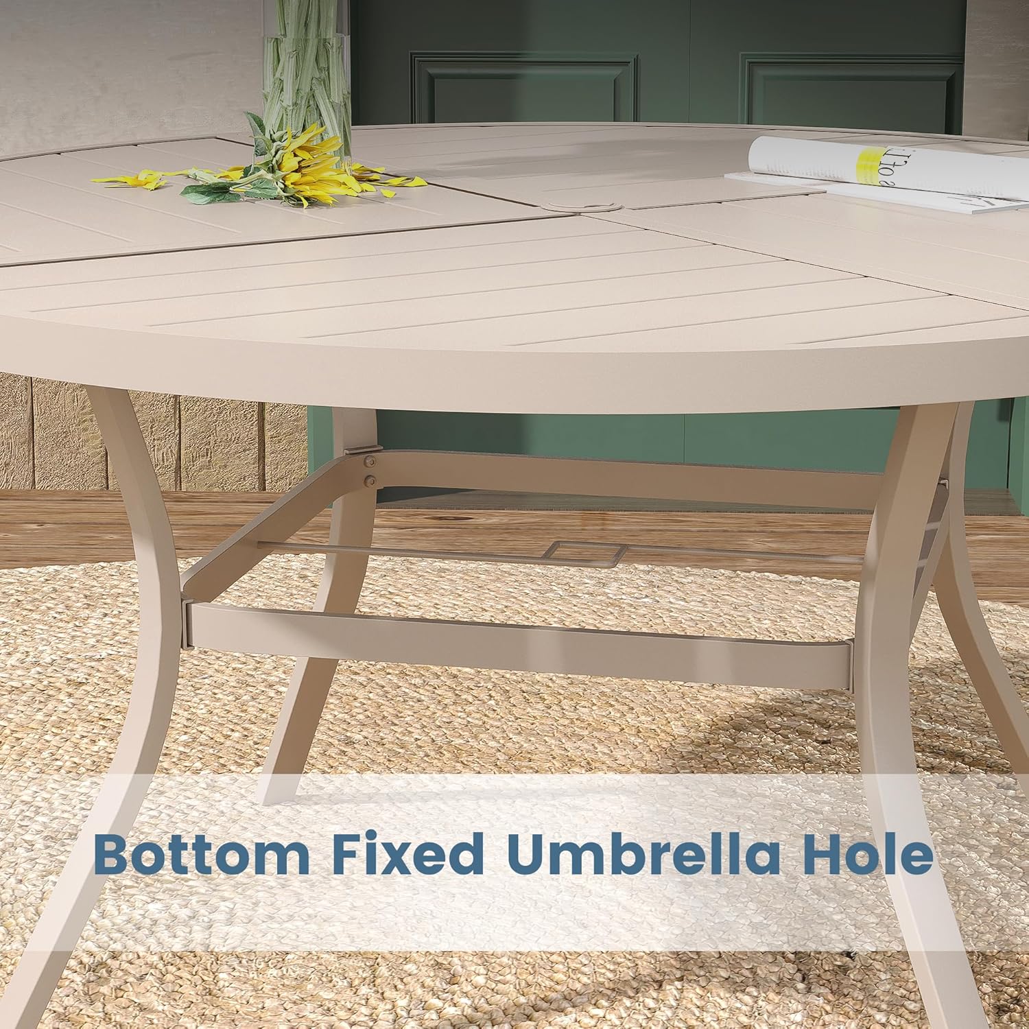 DIFY 53.1" Round Outdoor Patio Dining Table for 6-8, All-Weather Metal Steel Slatted Patio Table with 1.57" Adjustable Umbrella Hole, for Lawn Garden Porch Backyard, Sandshell