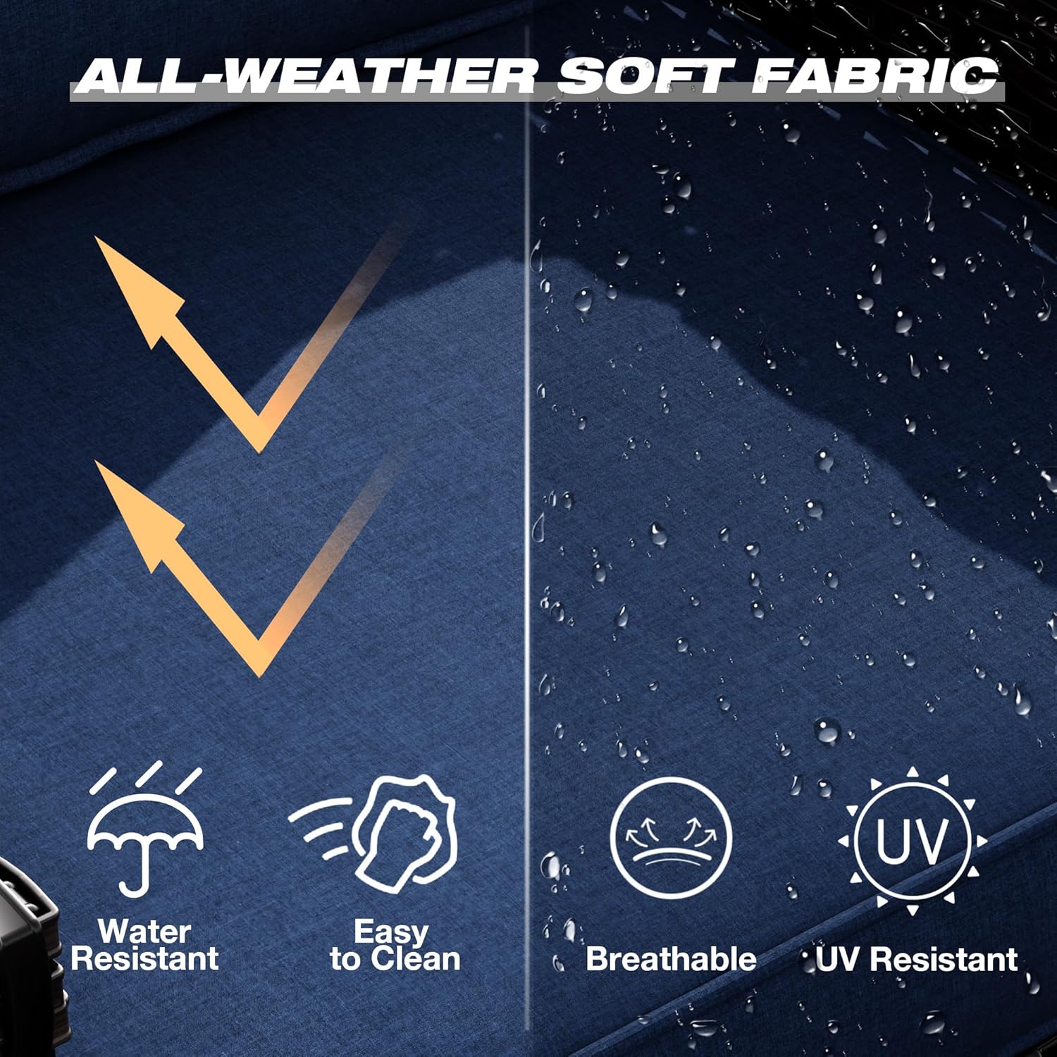 - Comfy Thick Cushion: Upgraded cushions are all made of high density sponge with 4 inches, thick sponge seat cushions and soft back cushions gives you comfortable support. The cushion cover is made from olefin fabric, which is breathable, UV-resistant, and waterproof. It features a zipper on the side for easy removal and cleaning