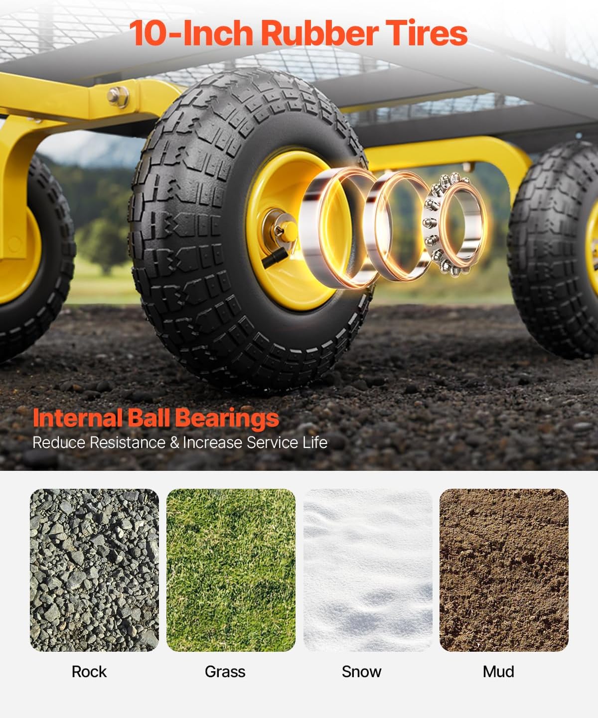 - 360° Rotating Wheels: Equipped with 10-inch rubber tires and metal hubs, the wheels of this heavy duty steel garden cart ensure smooth movement across various terrains, including grass, mud, rocks, and snow. Its sturdy design provides stability while reducing the effort required for transport.