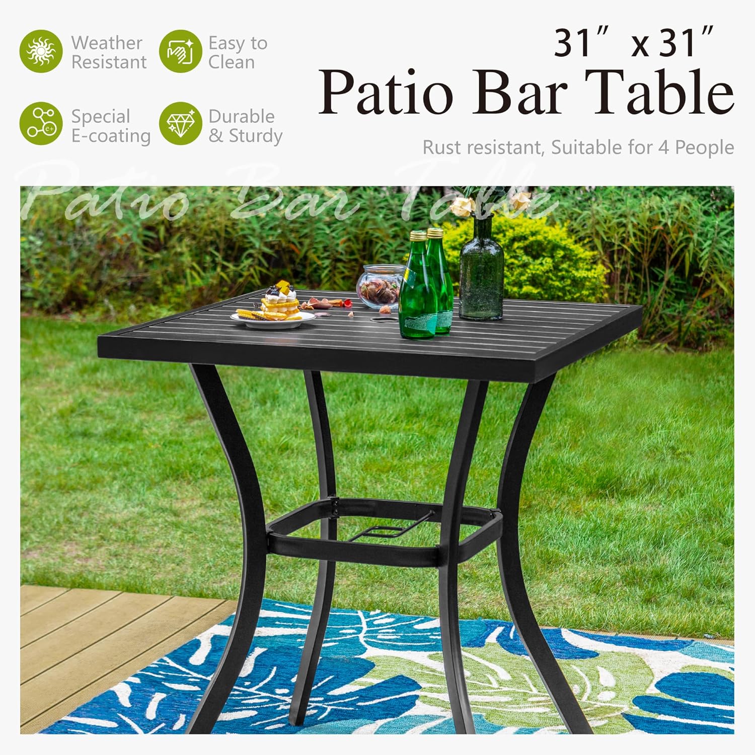 - Supportive and Comfortable: Enjoy the ultimate comfort with our patio bar set featuring a supportive backrest, armrests and footrests, providing a relaxing and ergonomic seating experience for extended periods. Seat height: 26.8, weight capacity: 300 lbs. Table size: 31L x 31W x 36H