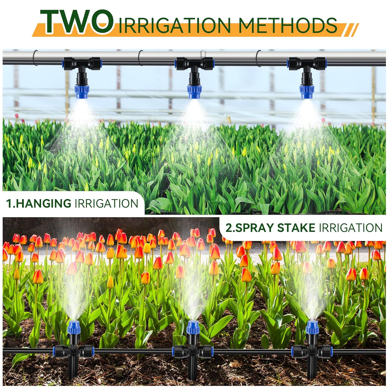 - Versatile Applications: designed with efficient water distribution, the greenhouse irrigation system kit can be hung for roof cooling or efficient greenhouse irrigation; Or stick the dripper stakes into the soil for lawn, patios, garden irrigation, vegetable beds, flower bed irrigation, raised beds and agriculture, ensuring your plants thrive in a comprehensive watering environment