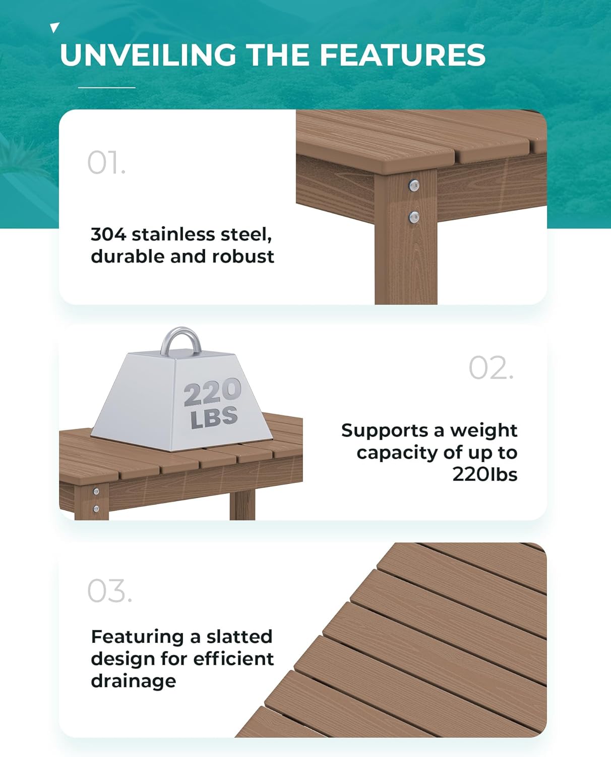 - Stability and Durability: The SERWALL outdoor table is a versatile addition to your patio. Whether you're using it as a footrest to complement your lounge chair or a convenient storage spot for your alfresco refreshments, this table is built to last. It's robust I-beam construction offers remarkable support, effortlessly bearing up to 220 pounds. Enjoy peace of mind knowing your outdoor space is equipped with a coffee table that combines both versatility and dependability.