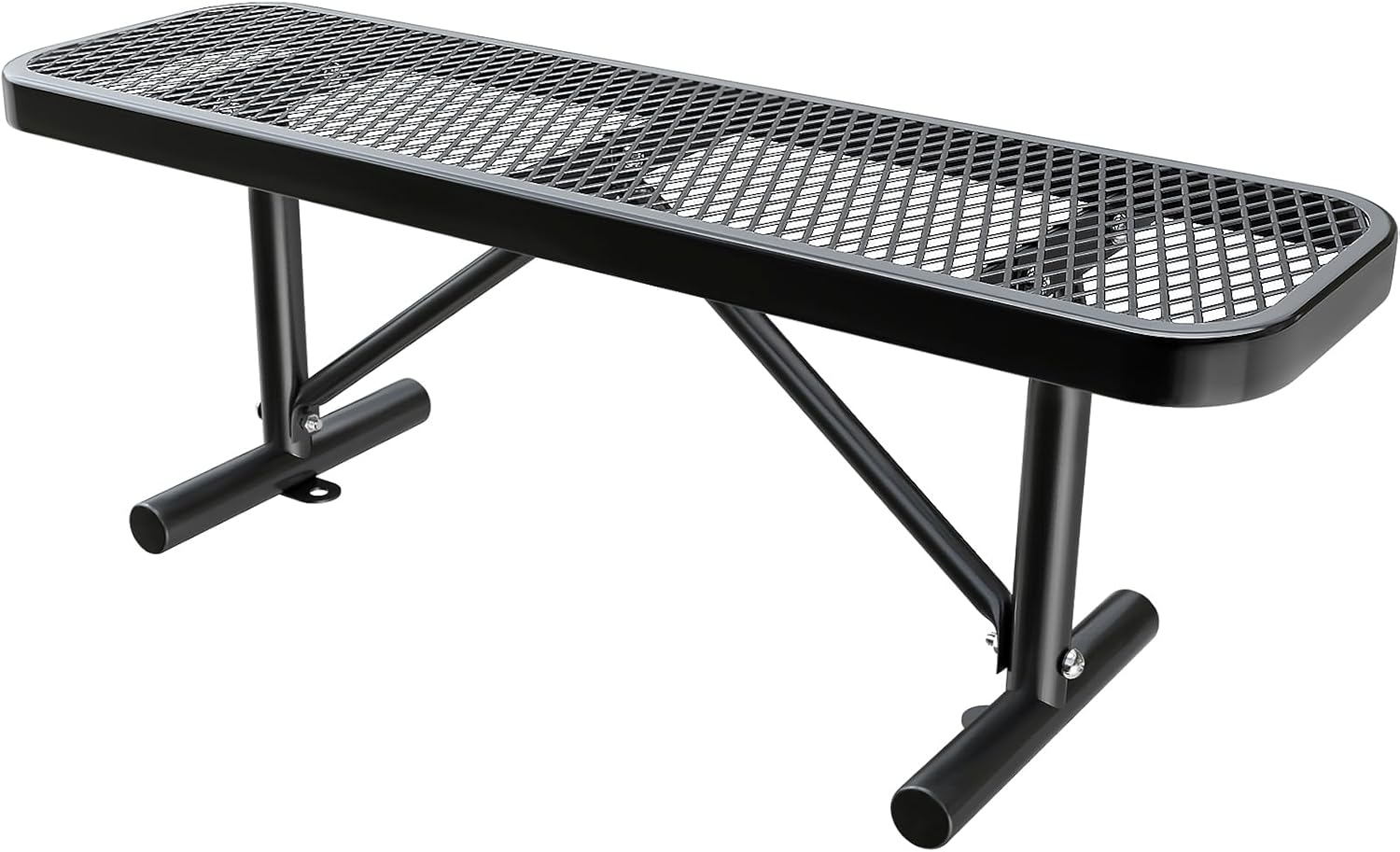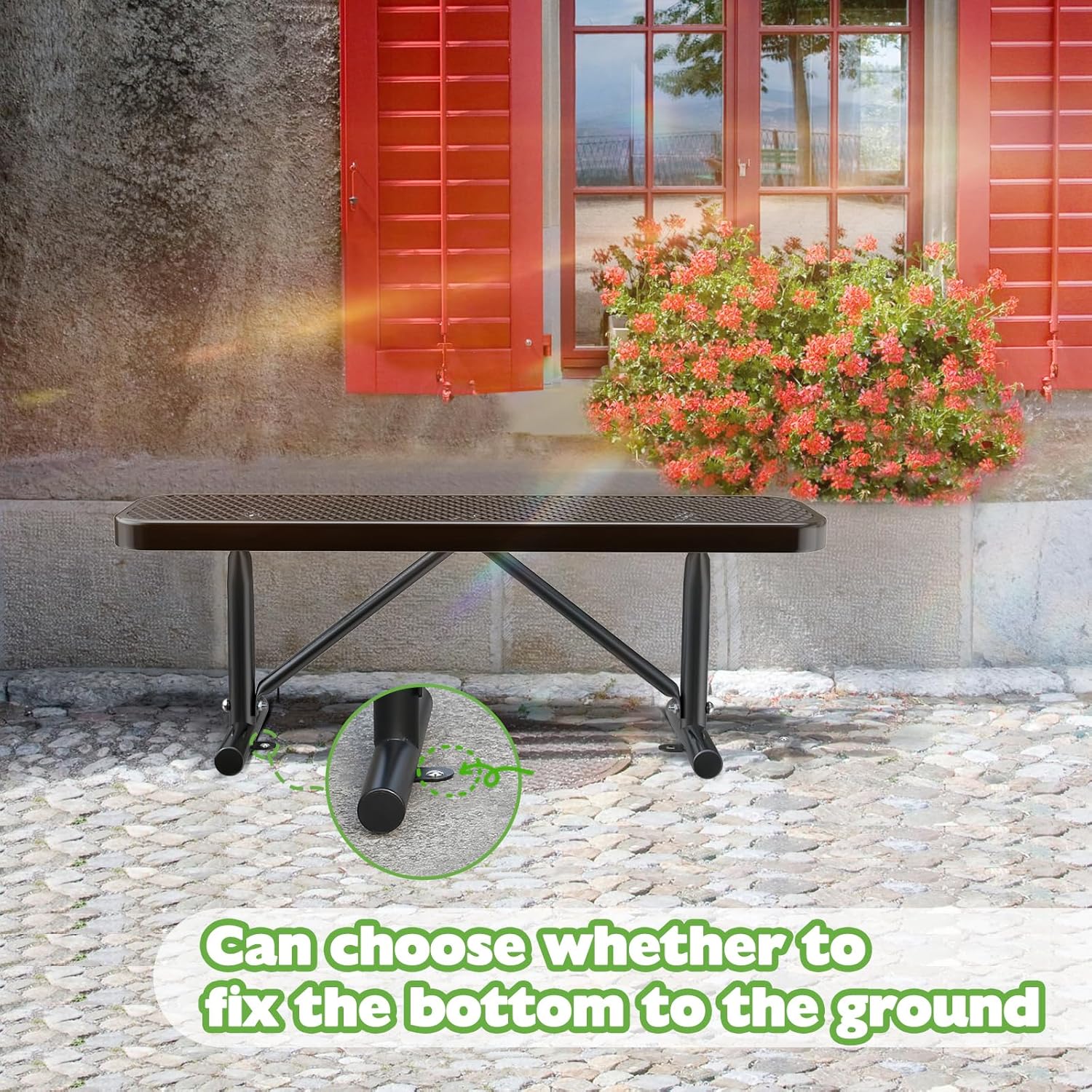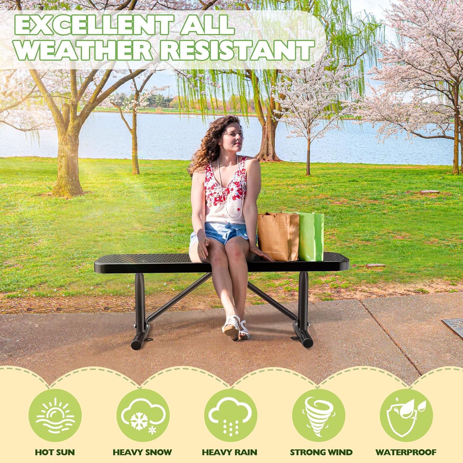 - Superior Craftsmanship: This 6 FT heavy duty park bench, sized at 48"-96”L x 23.2”W x 32.5”H, comfortably accommodates 2-7 people. Featuring a mesh cut-out design on the seat, it ensures both comfort and reduced weight, while stabilizing triangular supports provide a smooth seating experience.