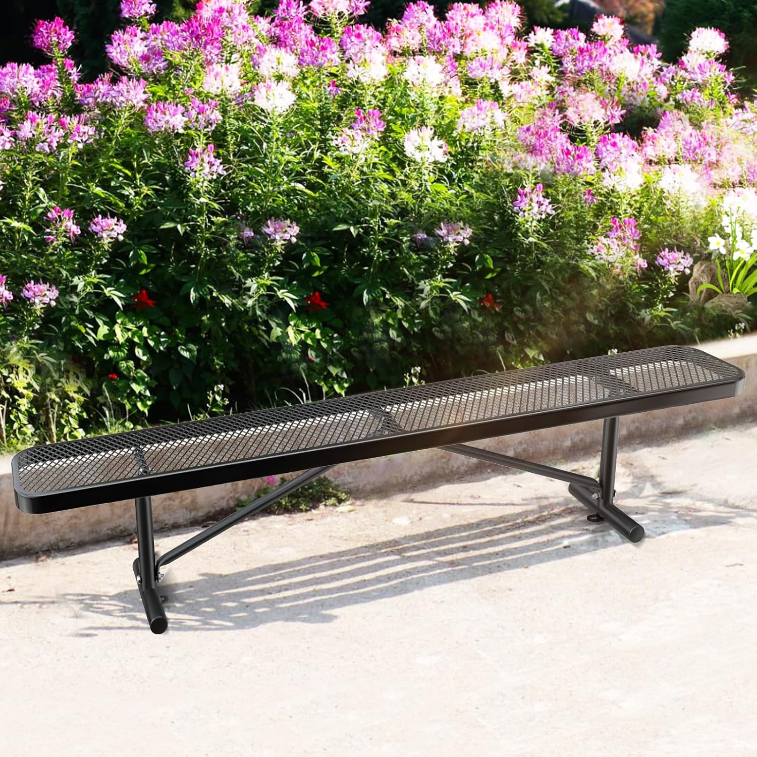- Superior Craftsmanship: This 6 FT heavy duty park bench, sized at 48"-96”L x 23.2”W x 32.5”H, comfortably accommodates 2-7 people. Featuring a mesh cut-out design on the seat, it ensures both comfort and reduced weight, while stabilizing triangular supports provide a smooth seating experience.